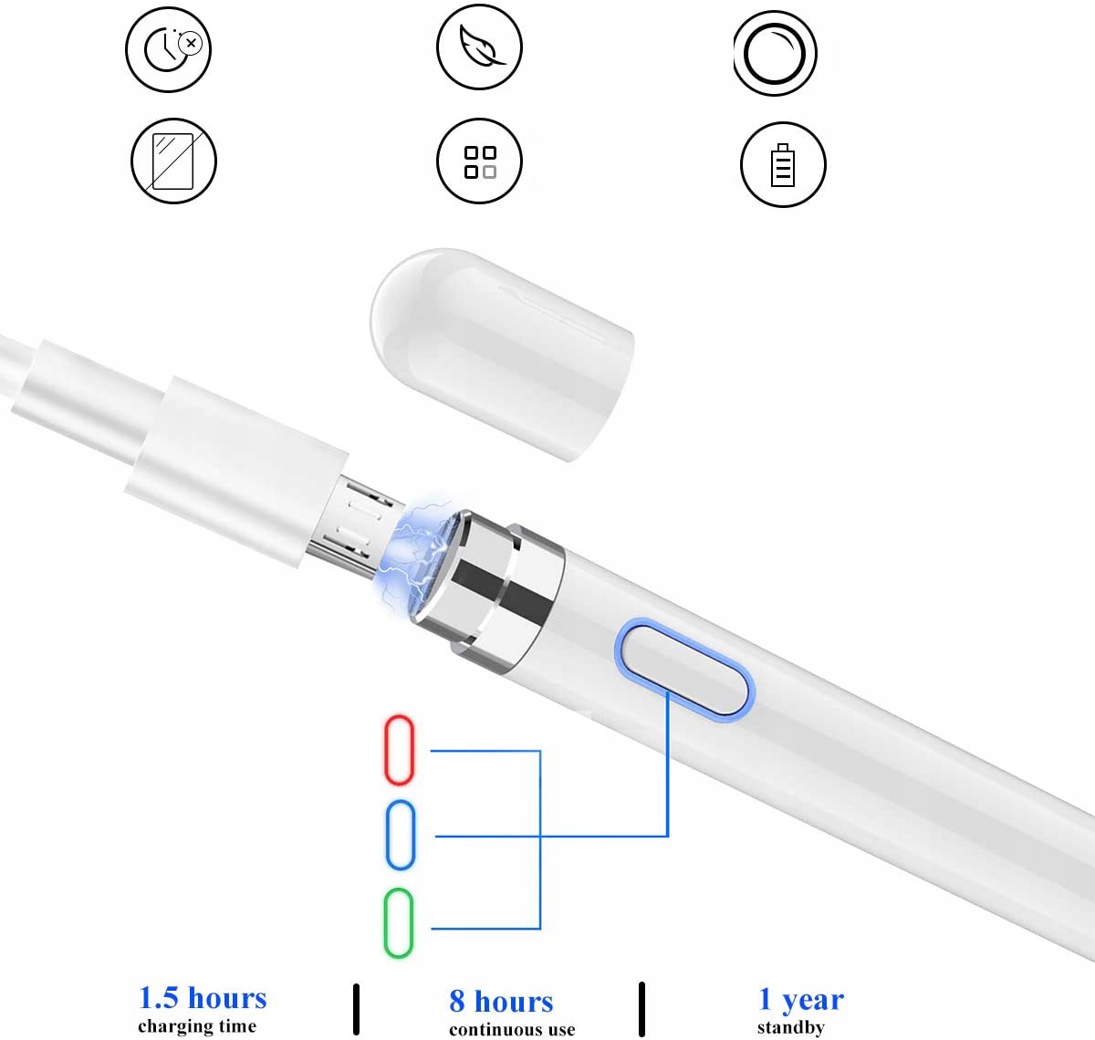 1. 100% нові ручки Stylus для пристроїв з сенсорним екраном з дуже чутливою сталь для малювання, письма, нот, дотику. Більш корисно та універсальний. Він ідеально вписується в мобільний телефон, планшет, ноутбук, всі пристрої з сенсорним екраном та гарним відчуттям ручки. Легко сформулювати завдяки технології активного виявлення, без додаткового приймача або пристроїв Bluetooth. Легка зарядка за допомогою порту Micro USB, 8 годин робочого часу. Забезпечує гладку ручку, наприклад, написання на планшеті з сенсорним екраном.