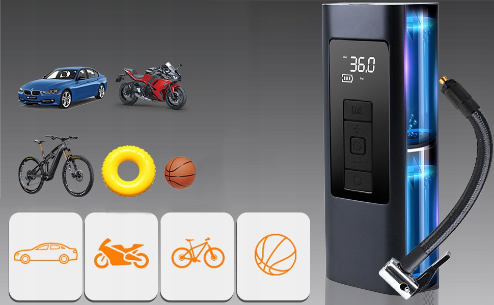 - За допомогою цього компресора ви можете легко накачати всі маленькі автомобілі (лише для малих автомобілів). автомобілі), велосипедні та мотоциклетні шини, кільця для плавання, надувні іграшки та інші надувні вироби за кілька хвилин
