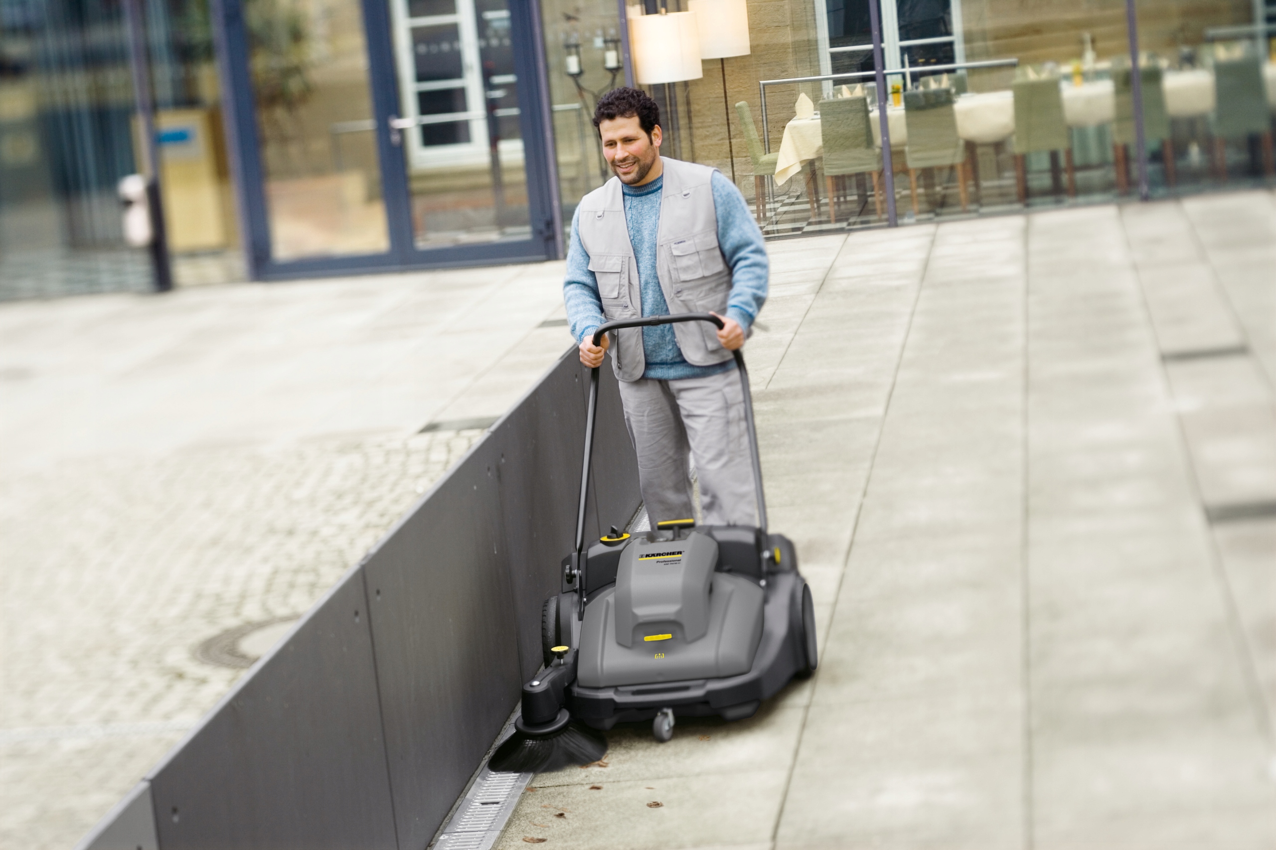 Прибиральна машина найкраще працює на невеликих площах, де потрібна легкість маневрування. Підмітальна машина характеризується тихою роботою, міцною конструкцією та винятковою простотою використання. Регулювання положення циліндричної основної щітки відносно поверхні дозволяє регулювати її висоту відповідно до нерівностей і типу поверхні, що очищається. Бічна щітка має плавне регулювання сили натиску. Це збільшує робочу ширину пристрою і дозволяє підмітати біля стін і бордюрів. Дана модель пристрою працює від акумулятора і має основну і бічні щітки з електроприводом. Він також відрізняється функцією всмоктування, яка дозволяє підмітати майже без пилу. Прилад додатково оснащений плоским гофрованим фільтром з поліестеру. Невеликі розміри полегшують маневрування та зберігання пристрою. Складана направляюча ручка та можливість розташувати підмітально-прибиральну машину у вертикальному положенні дозволяють їй займати надзвичайно мало місця.