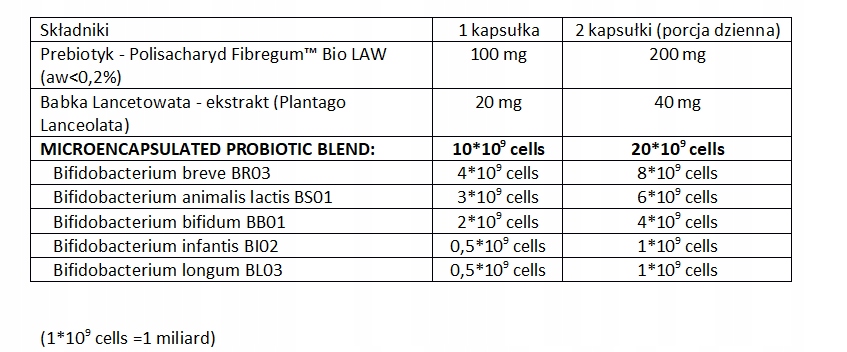 СКЛАД: Пребіотик - полісахарид Fibregum™ Bio LAW (aw<0,2%), екстракт подорожника (Plantago Lanceolata), Bifidobacterium breve BR03, Bifidobacterium animalis lactis BS01, ifidobacterium bifidum BB01, Bifidobacterium infantis BI02, Bifidobacterium longum BL03, бактеріальна оболонка: ефіри гліцерину жирних кислот, оболонка капсули (гідроксипропілметилцелюлоза).