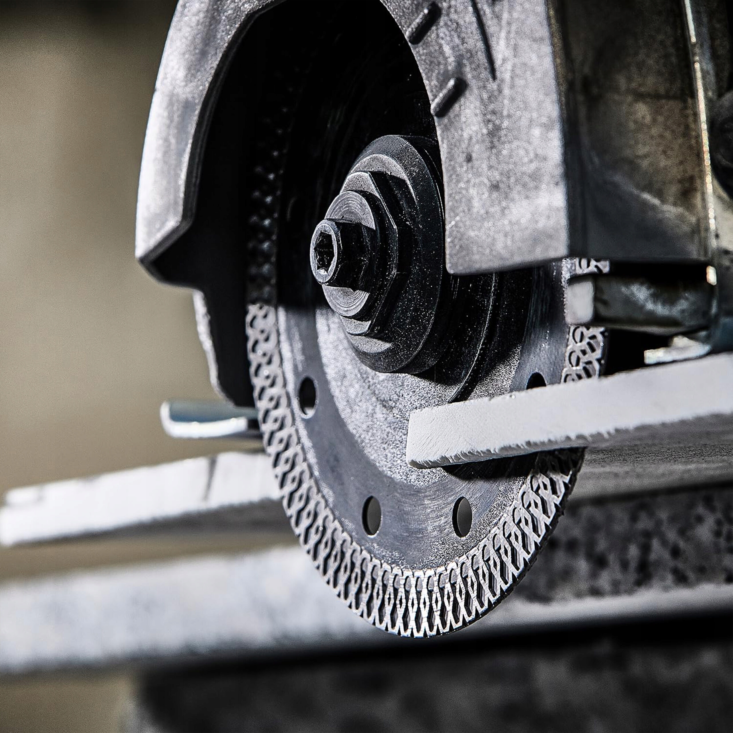 Диск сумісний з кутовими шліфувальними машинами для сухого та мокрого різання. Він має спеціальний сегмент під назвою рифлений край, який забезпечує швидке та дуже стабільне різання. Ретельний підбір продукції для виготовлення щита впливає на економічність і швидкість роботи. Він ідеально підходить для простих домашніх справ, а також для професійного використання в промисловості та ремеслах. Монтажний отвір 22,2 мм + адаптер 2 мм.