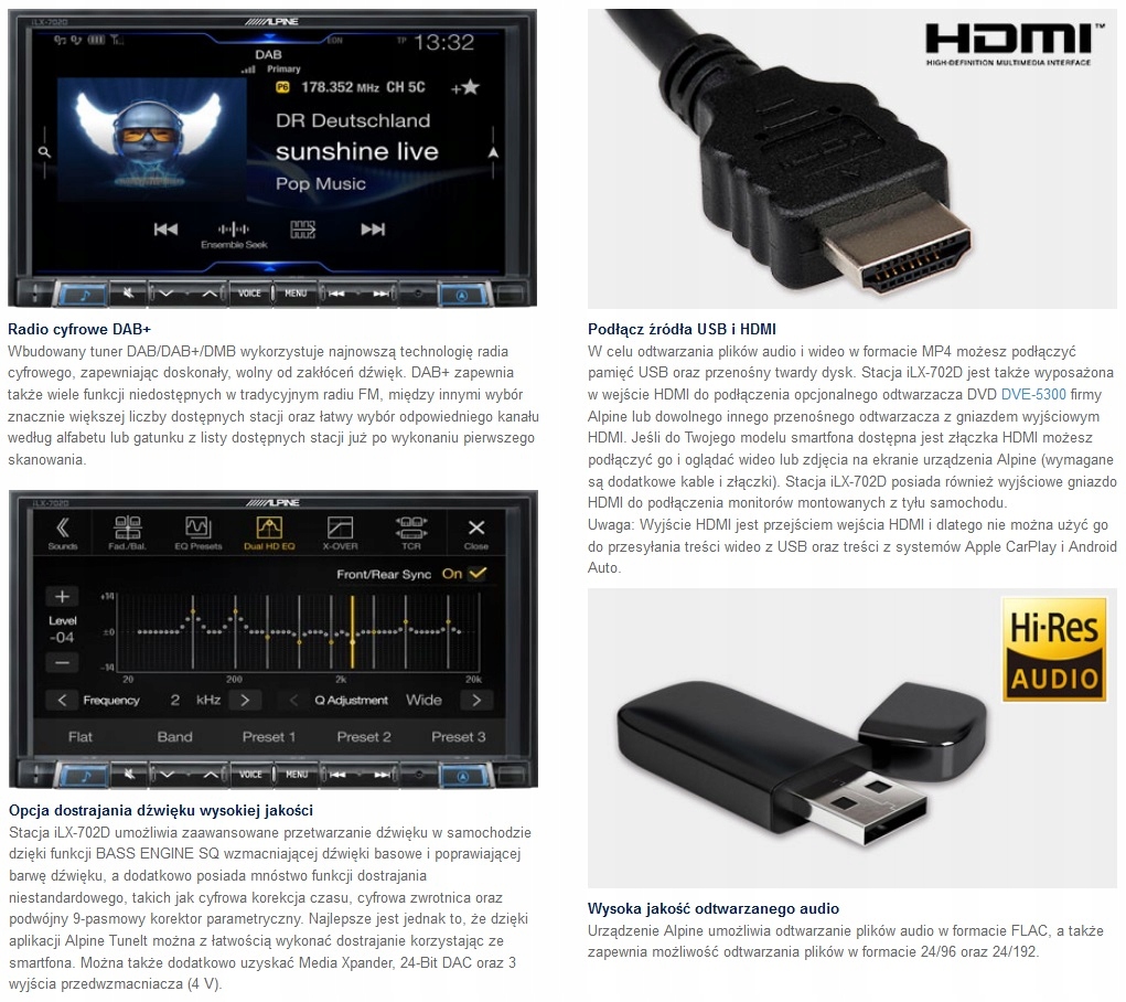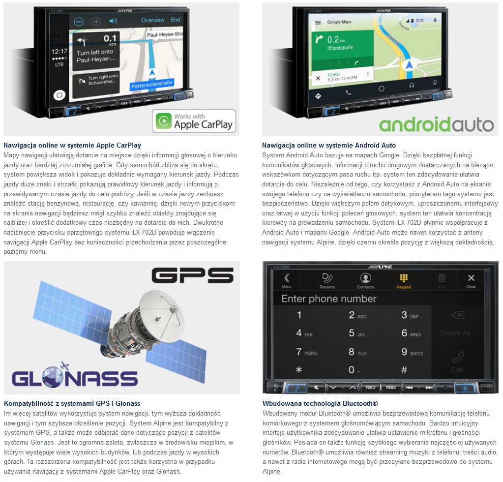 Мультимедійна станція iLX-702D забезпечує сумісність із найновішими медіафайлами, функцією онлайн-навігації та аудіофільською якістю звуку, типовою для пристроїв Alpine. Вона повністю сумісна з найновішими смартфонами, такими як iPhone 7 і Galaxy S7, і дозволяє використовувати Android Auto та Apple CarPlay на 7-дюймовому сенсорному екрані з високою роздільною здатністю.
