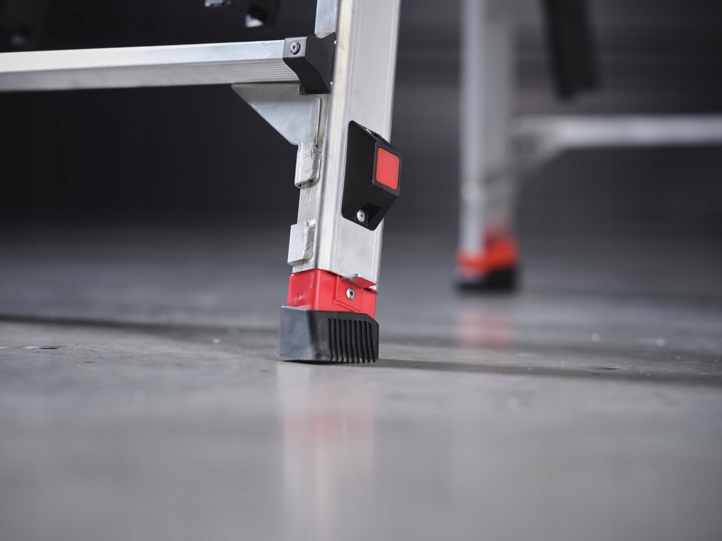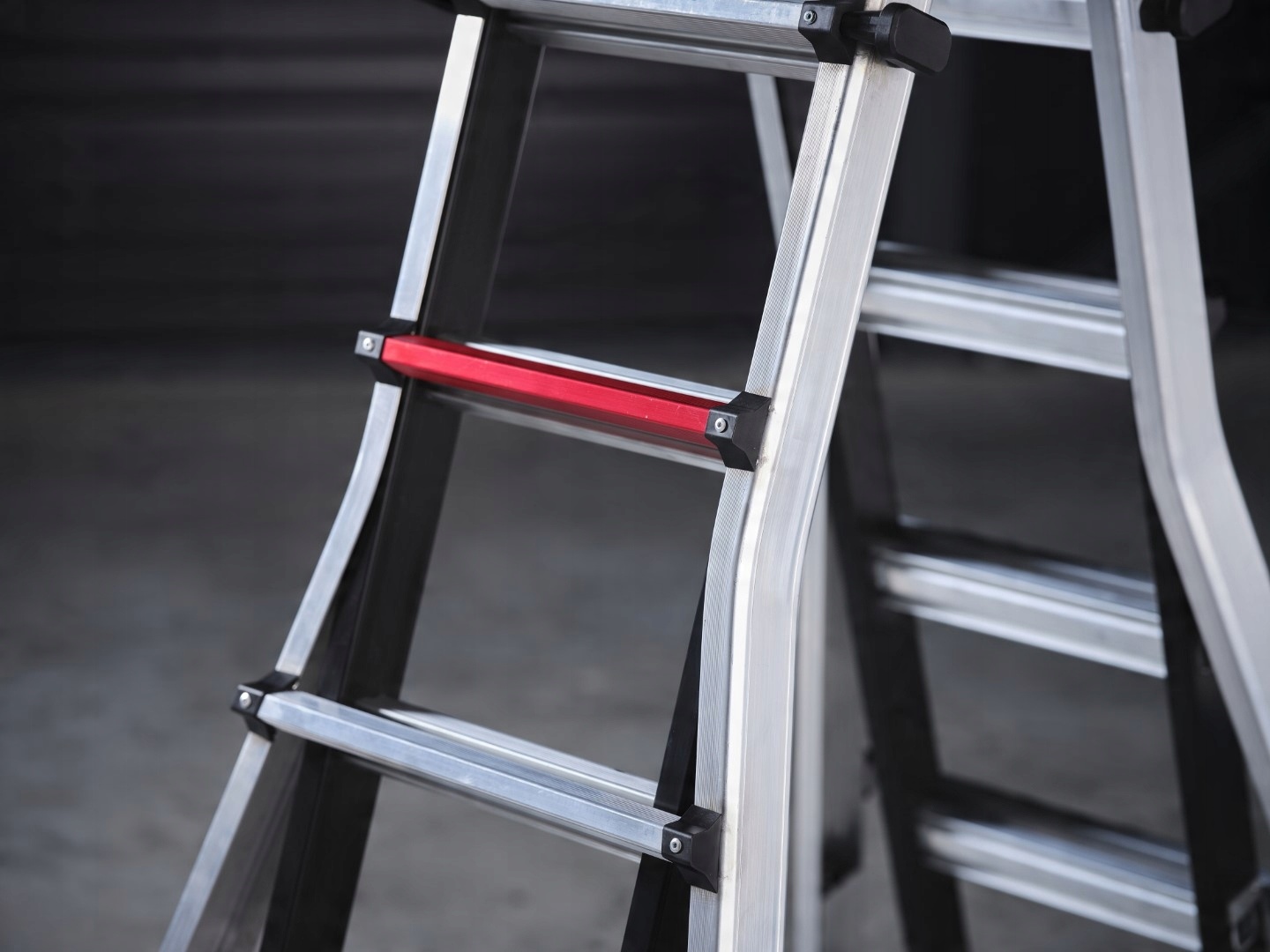 Практичні кольорові маркування: червоні елементи вказують на точки регулювання ключів, що полегшує експлуатацію драбини.