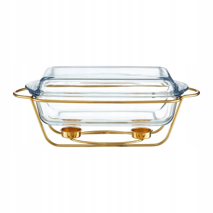 Форма для запікання ідеально підходить для сімейних зустрічей і вечірок. Прикріплена золота рамка для чайних свічок збереже потрібну температуру страви після виймання з духовки. Конструкція рами дозволяє безпечно поставити гаряче блюдо на стіл. Прямокутна форма посудини та профілювання рами були створені з урахуванням практичності. Поєднання золотої рами і прозорого скла впишеться в будь-який стиль інтер'єру. Для виготовлення посудини використано жароміцне скло найвищої якості, яке може використовуватися (без рами) при температурах від -40°C до +300°C. Така висока стійкість як до низьких, так і до високих температур робить посуд придатним для зберігання в холодильнику і для використання в духовці. Крім того, скляну посудину (без рами) можна мити в посудомийній машині.