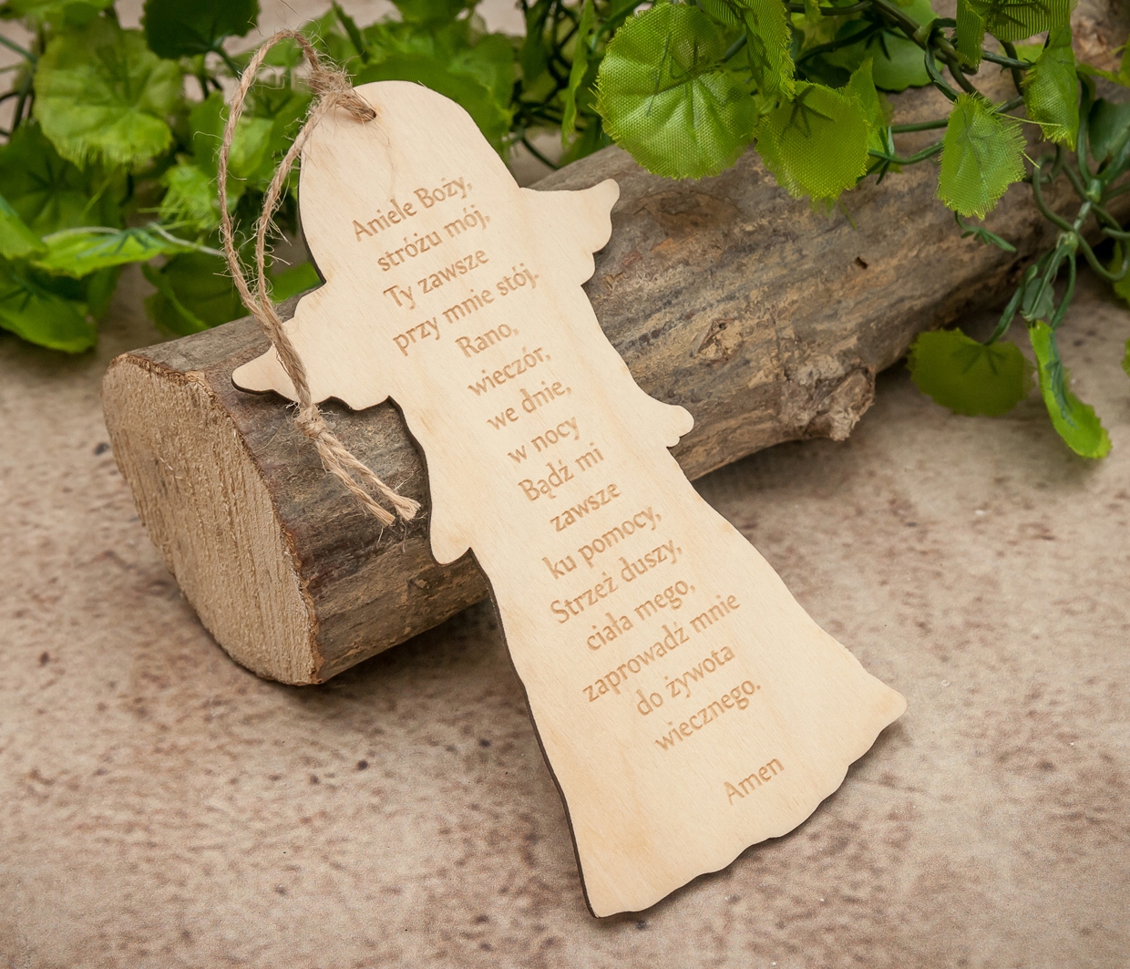 Ангел виготовлений з фанери товщиною 3 мм. У набір входить шнурок із різнокольоровою дерев’яною намистиною (колір вибирається випадково).