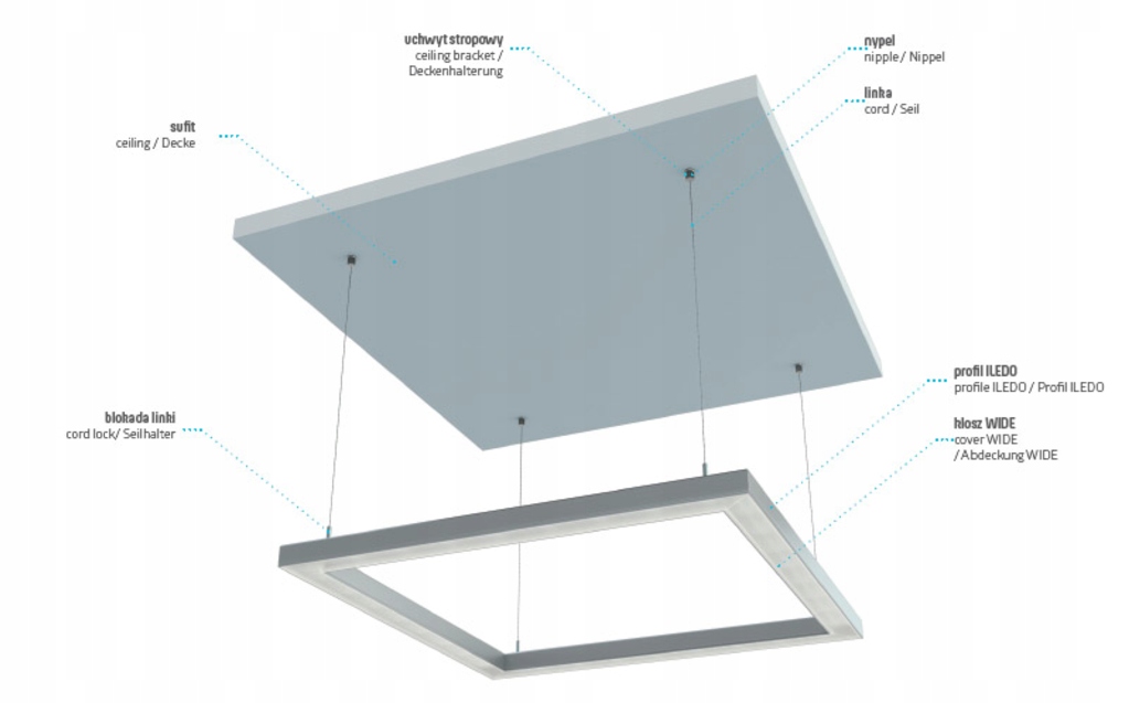 - профіль можна встановити як підвісне освітлення за допомогою монтажних мотузок (не входить в комплект) або як поверхневе освітлення, встановлене за допомогою монтажних кронштейнів або клею