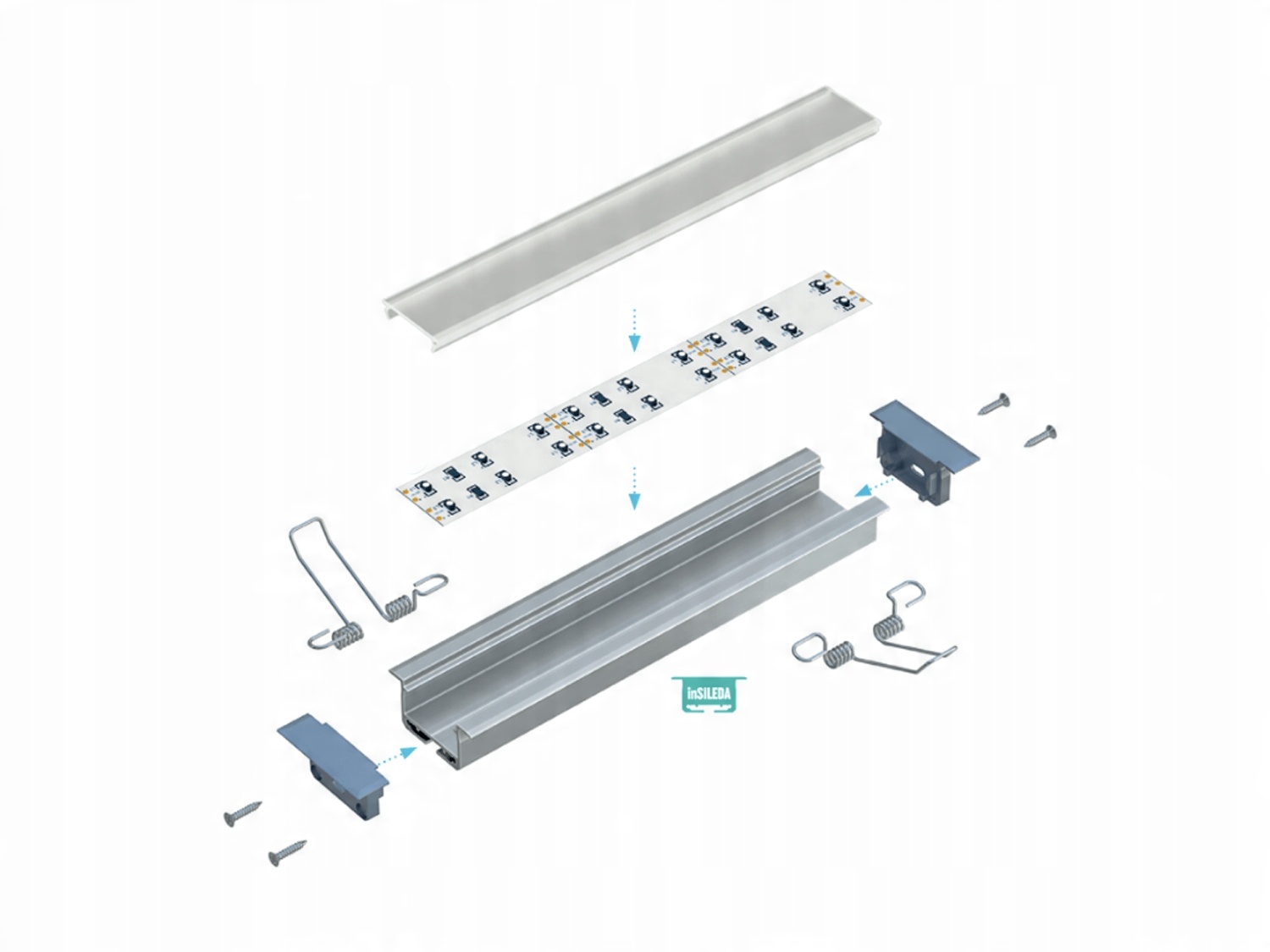 - алюмінієвий профіль для світлодіодних стрічок можна легко встановити за допомогоюмонтажного клею або монтажних пружин