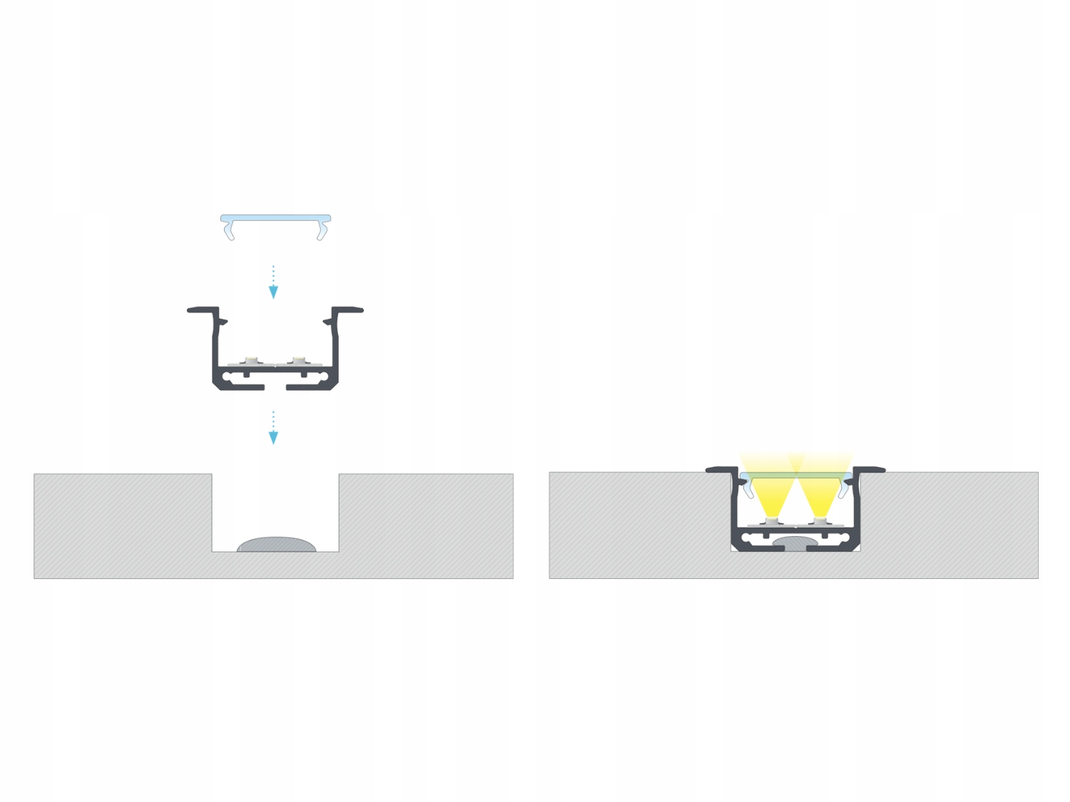 - Примітки: світлодіодні стрічки IP65 не слід встановлювати в профіль з абажуром. Така установка може пошкодити встановлену світлодіодну стрічку та абажур, а також призвести до втрати гарантії