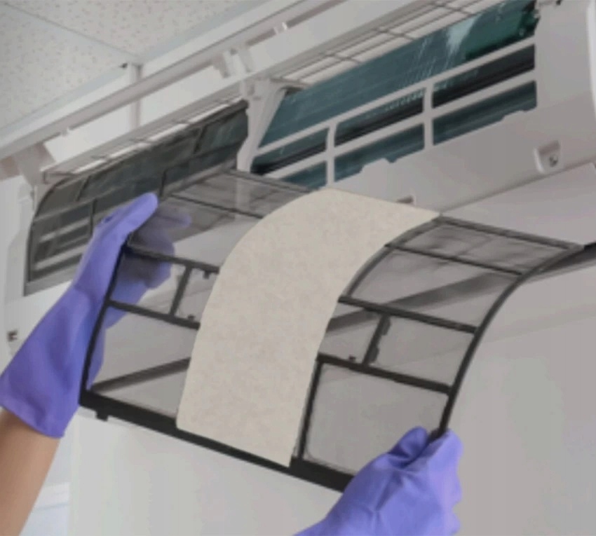 Фільтр встановлений на чистому кондиціонері за допомогою вбудованої стрічки. клей.