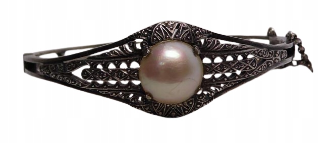 АНТИЧНИЙ БРАСЛЕТ НА КОЛЕСІ З ПЕРЛАМИ. Браслет зі срібла приблизно 0,830 г. Внутрішня окружність 16,2 см. Ширина прикраси 1,78 см. Діаметр перлини 1,15 см (натуральна культивована перлина або справжня морська перлина, захищена знизу перламутром) Висота прикраси з перлиною 8,2 мм. Колесо відкривається на петлі, застібка "шухляда" з ланцюжком безпеки. Ювелірні вироби 1900 - 1930 років виготовлення, винятковий стан.