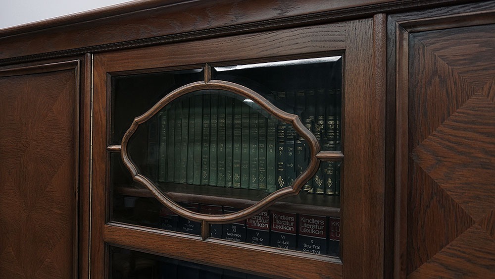 Кабінет складається з бібліотеки, письмового столу та крісла, виготовленого з дуба в техніці маркетрі. Унікальною перевагою бібліотеки є її часткове скління, виконане з оригінального, кришталевого, скошеного скла, що надає їй позачасовий вигляд і характер. Стіл має 5 ящиків і висувні полиці. Він дуже місткий і функціональний. Крісло оббито м'яким велюровим матеріалом красивого зеленого відтінку, з Італії.