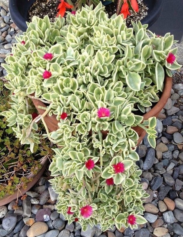 Аптека «Мезоой -трейл -червоний», також відомий як «Лівінгстон Дейзі», є привабливою рослиною з м'ясистим, зеленим листям з ніжним білим краєм і маленькими, червоними квітами, ромашками. Її висячі пагони роблять її ідеальним вибором для висячих кошиків, балконних ящиків та як землевпорядка в саду. Легко вирощувати і толерантно до посухи, що робить його чудовою пропозицією для кожного любителя рослин.