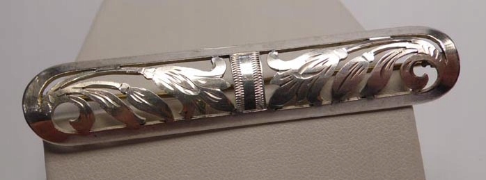 АР-ДЕКО СРІБНА БРОШКА РУЧНОГО ВИТРАЖЕННЯ, РОСЛИННИЙ МОТИВ. Брошка ручної роботи зі срібла 0,835 (тиснення на звороті з написом HANDARBEIT). Розміри: 1,33 х 6,9 см. Ювелірні вироби, виготовлені приблизно в 1920-1940 роках.