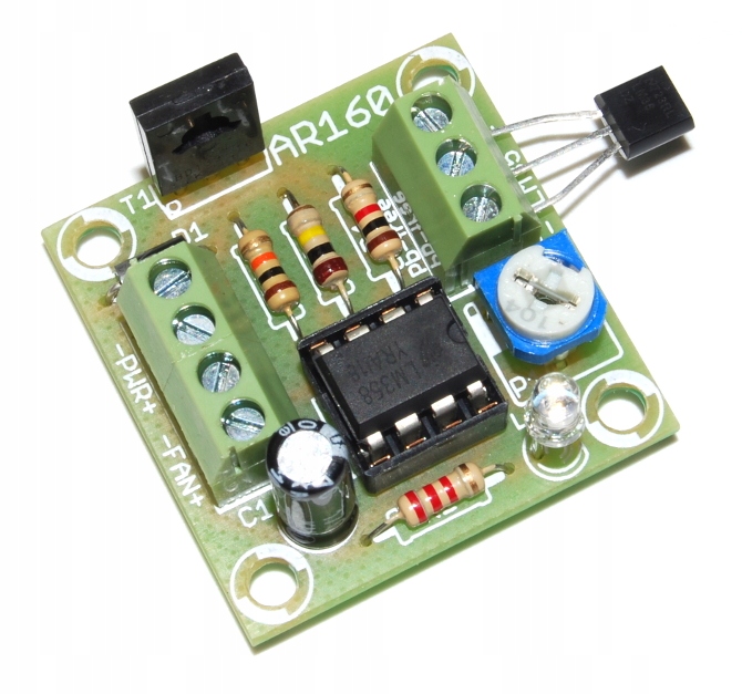 Система керує вентилятором, адаптуючись до поточних потреб в охолодженні. Він працює як регулятор, збільшуючи або зменшуючи швидкість, щоб забезпечити контрольованому пристрою оптимальні умови роботи. Швидкість вентилятора збільшується зі збільшенням температури. Використовувався точний датчик LM35. Температурна чутливість регулюється за допомогою потенціометра. Регулювання швидкості обертання вентилятора знижує потребу в електроенергії, зменшує шум і збільшує довговічність двигуна. Система вентиляторів може використовуватися для охолодження ПК, блоків живлення, підсилювачів потужності, регуляторів або інших пристроїв, які виділяють значну кількість тепла під час роботи. Завдяки використанню транзистора середньої потужності можна керувати навіть великими вентиляторами з струмом споживання понад 1,5 А. Невеликі розміри плати дозволяють легко розмістити модуль в інших пристроях.