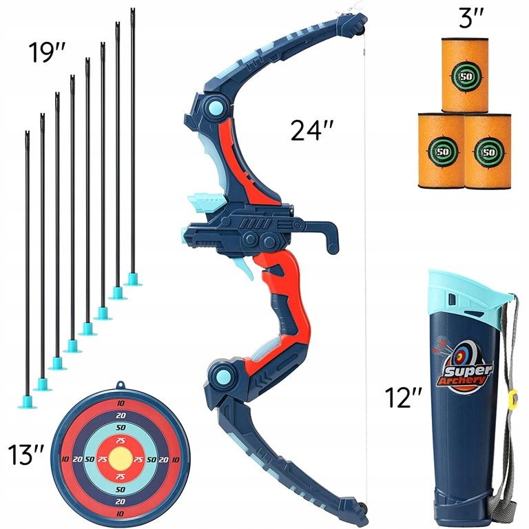 Archery Set - Щоб діти вивчали фізику, арка розроблена з прицілами, щоб допомогти дітям навчитися встановлювати кути та випускати силу. Завдяки м'якій гумку на печері діти можуть безпечно грати з нею. Набір дуг і стріл містить 8 постійних пострілів та два типи цілей (3 цілі піни та 1 висяча ціль), щоб ви могли повністю використовувати свій лук. 4 Як справжній лучник: потягніть і відпустіть. Це чудова іграшка, яка покращує концентрацію, координацію, швидкість реакції та пильність реакції. Ця арка допомагає зміцнити дитячі руки та пальці. Ідеально підходить для дітей від 6 до 14 років.
