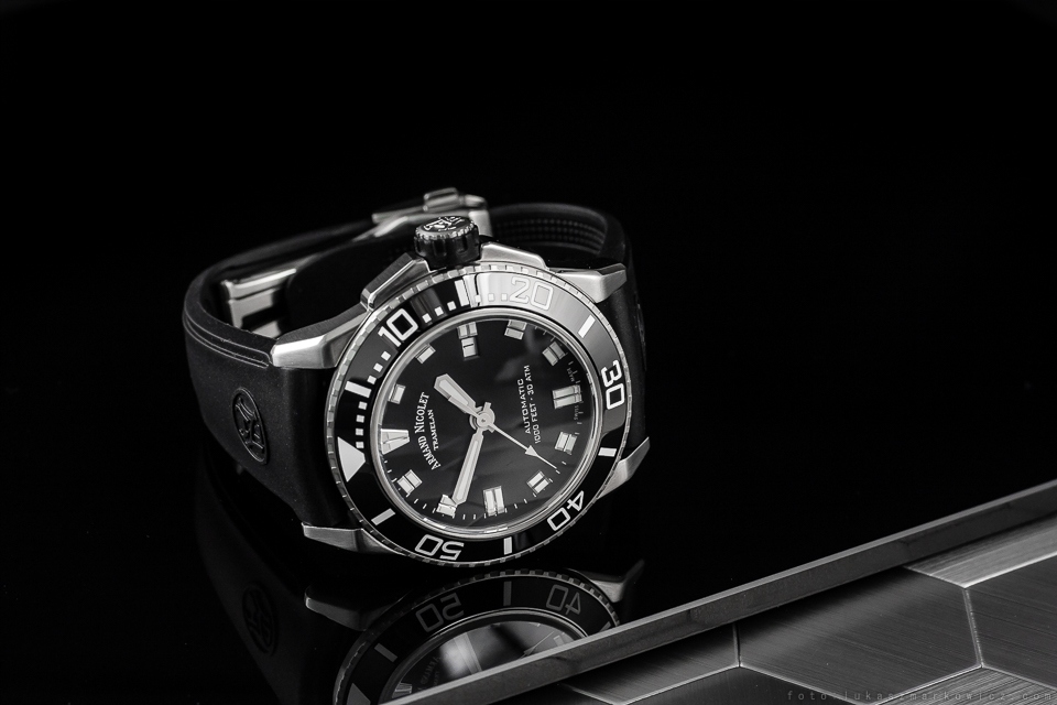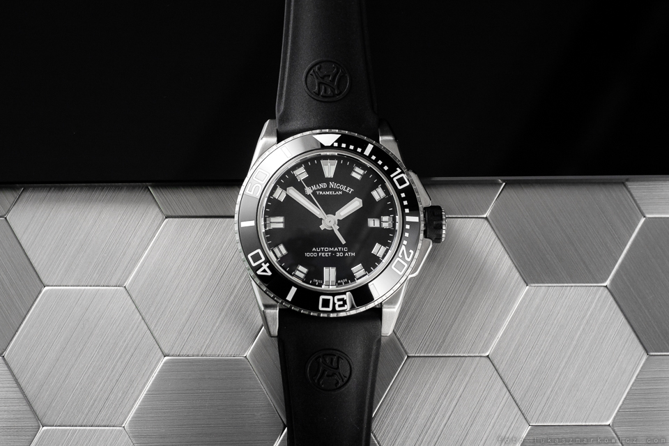 чорний. Підписано маркою Armand Nicolet, з опуклими люмінесцентними покажчиками та стрілками та класичним віконцем із датою.