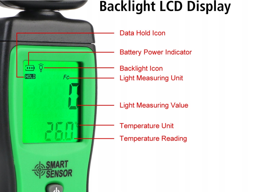 - Широкий вимірювальний діапазон 0-200 000 люкс та автоматична/ручна зміна діапазону. РК -дисплея з підсвічуванням для легкої роботи в темряві.