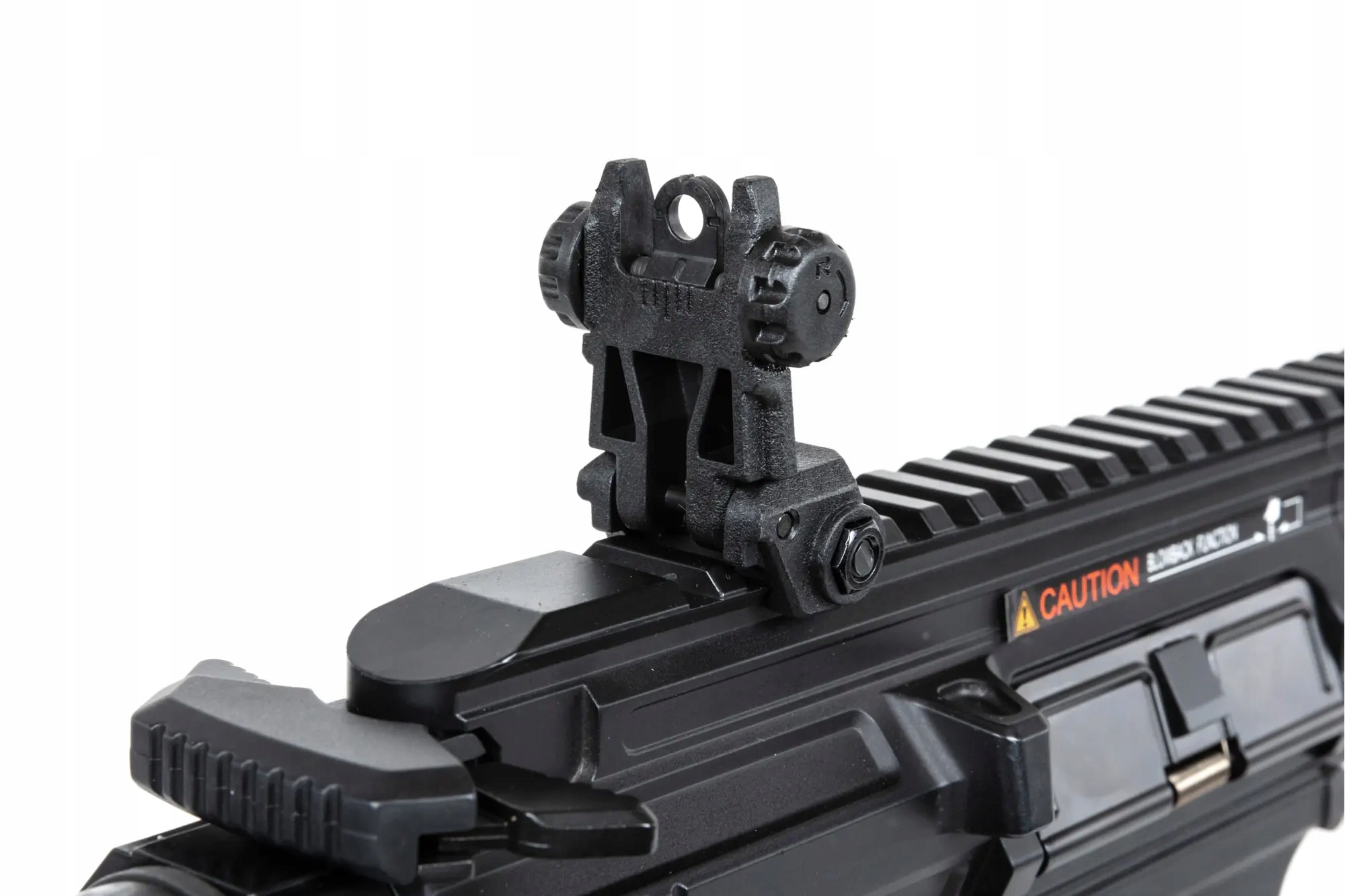 Виготовлений алюміній: бластер підсилювача, 13-дюймовий ліжко M-Lok, корпус репліки, дорсальна рейка RIS, недолік, зовнішня бочка та двостороння ручка перезавантаження. З сталі ми знаходимо глушник полум'я, всі гвинти та шпильки та тактичну підвісну пластину. Пластик зробив ергономічний зчеплення пістолета, регульовану колбу та приціли.