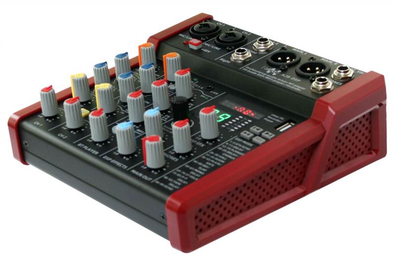 - Компактний аудіо змішувач з параметрами 2 моно + 2 стерео вводу -канали, плюс стерео міні -вхід. Кожен моно -канал має комбінований вхід XLR/JACK з перемикачами фантомного джерела живлення +48 В по парах для входів XLR.