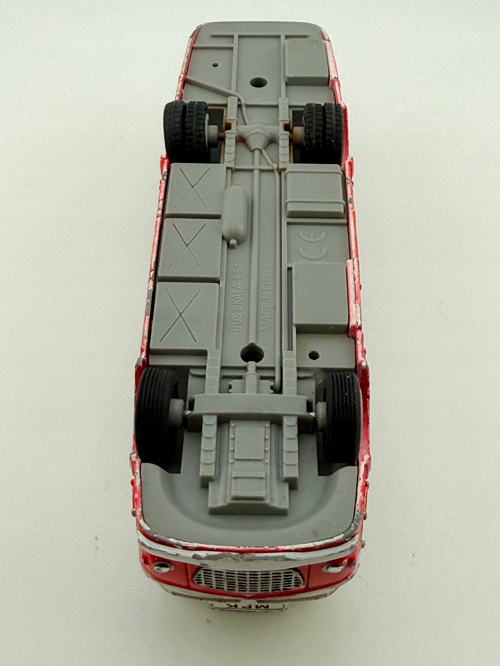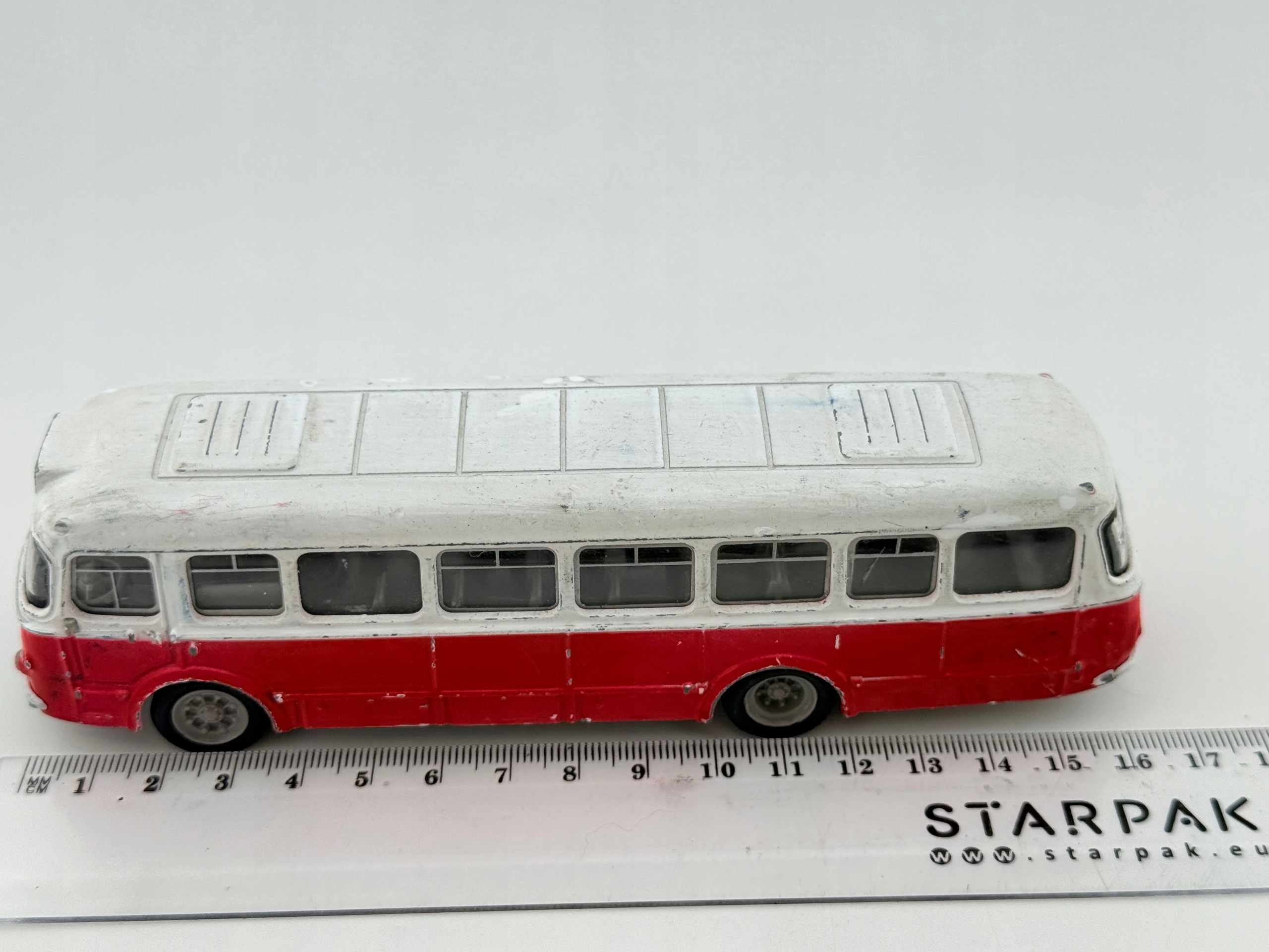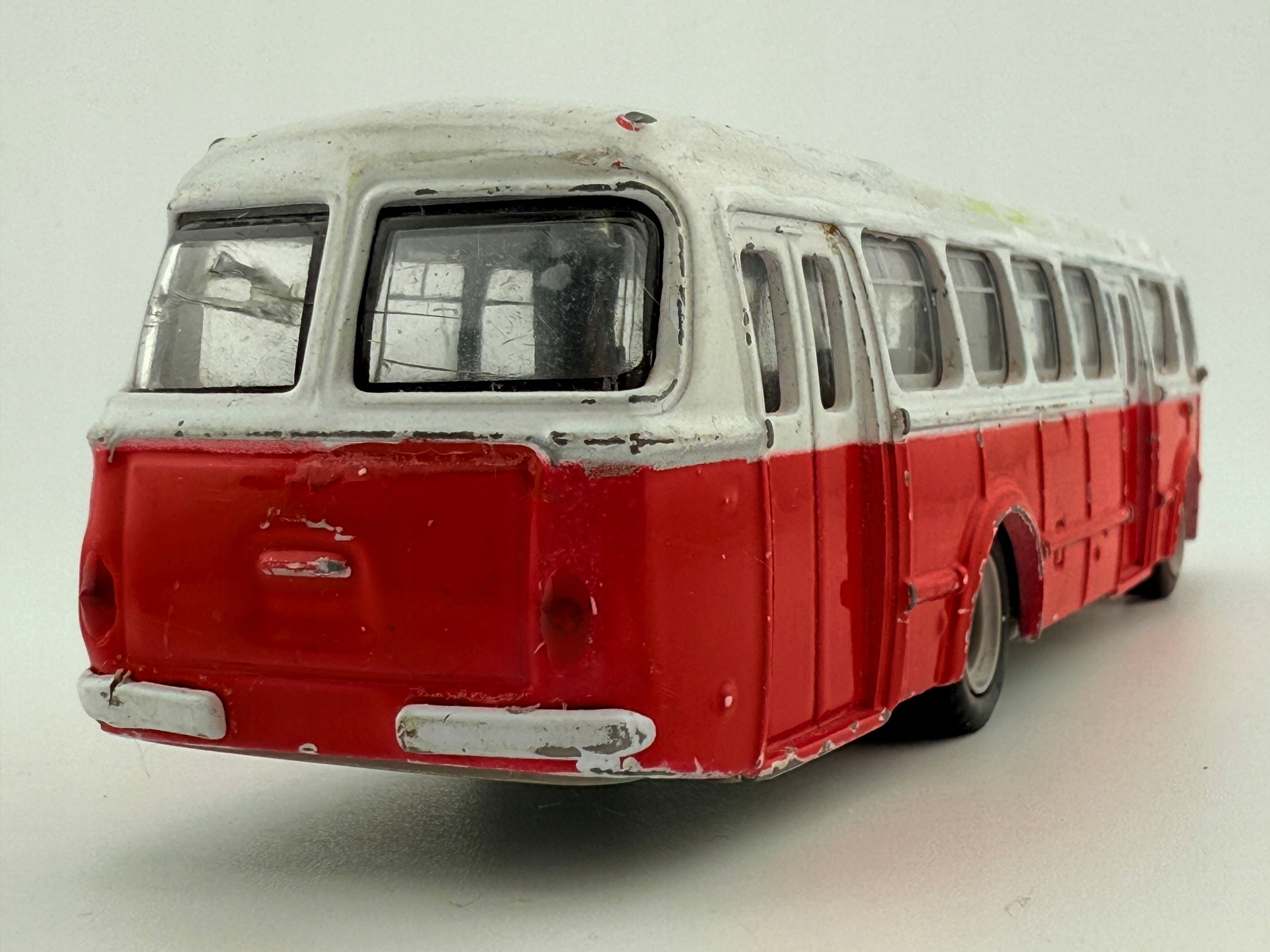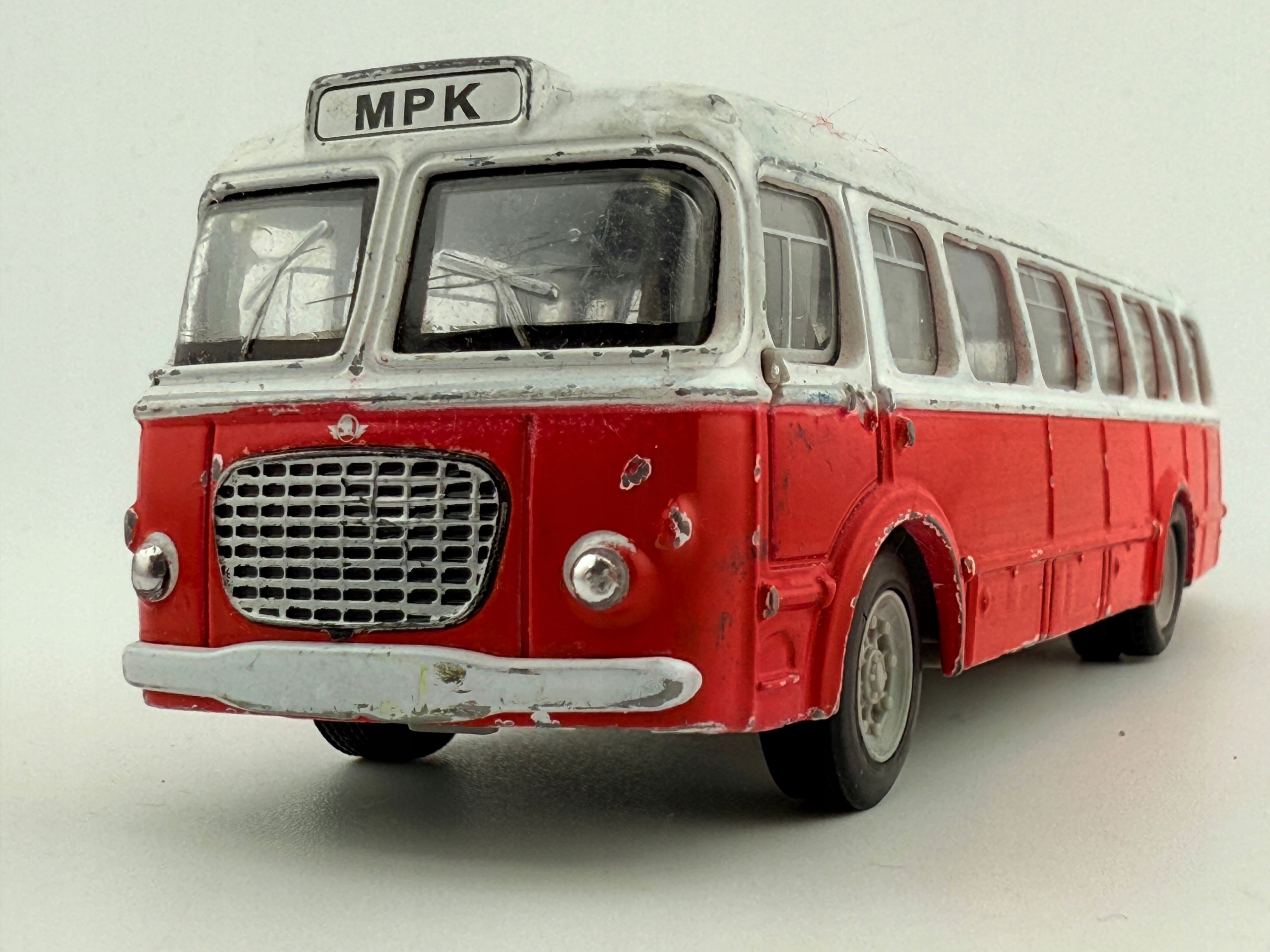 Модель показує класичний автобус, відомий як весна, червоно -біле. Його тіло виготовлено з металу, що надає йому міцності та ваги. Додаткові деталі, такі як напис MPK на даху та детальна картина, привертають увагу колекціонерів. Незважаючи на видимі ознаки використання, модель зберігає свою чарівність та характер. Це ідеальне доповнення до будь -якої колекції, як для любителів автомобілів, так і для любителів іграшок.
