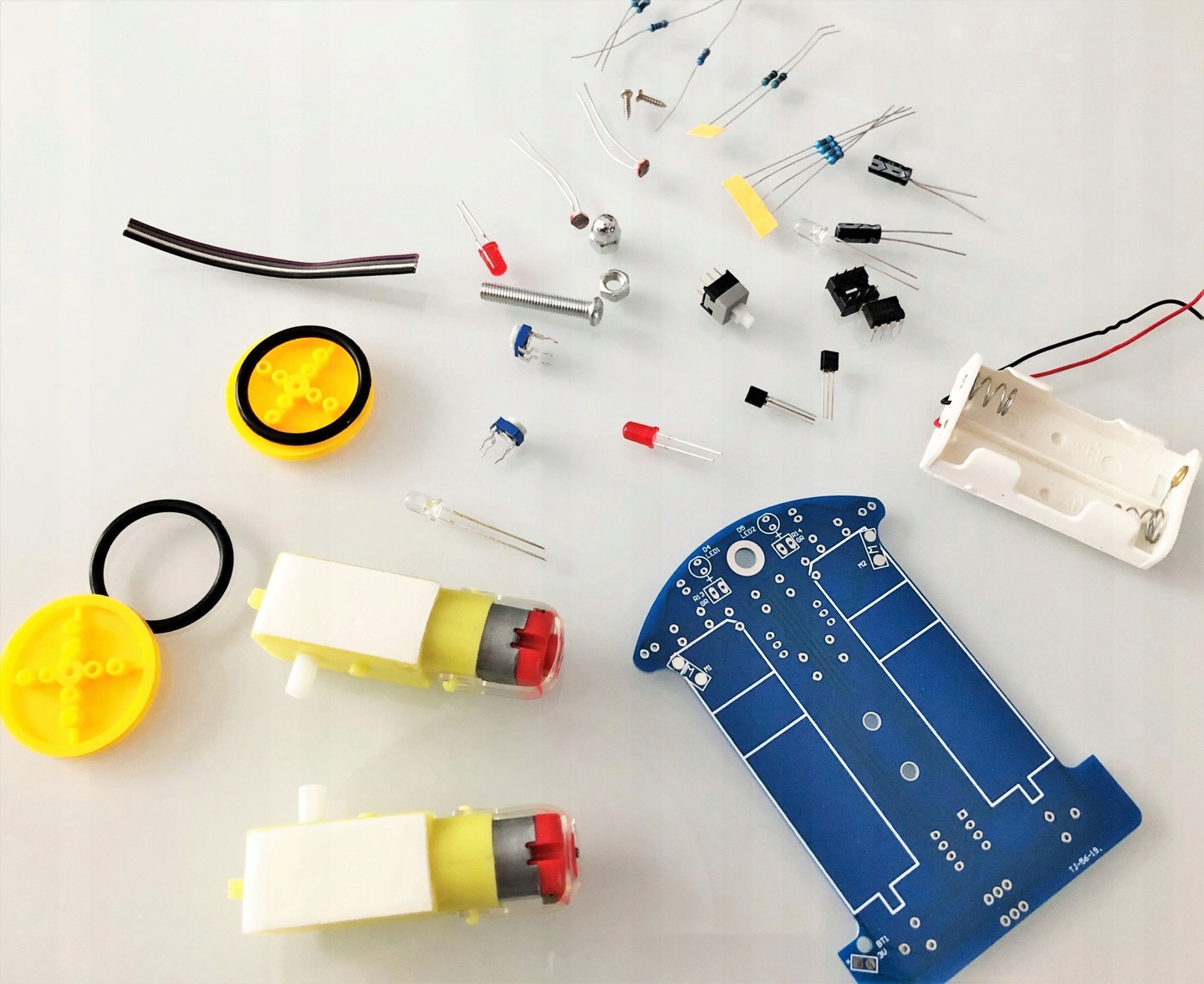 Усі компоненти для складання робота, чотири типи резисторів повинні бути розпізнані за смужками, схемою.