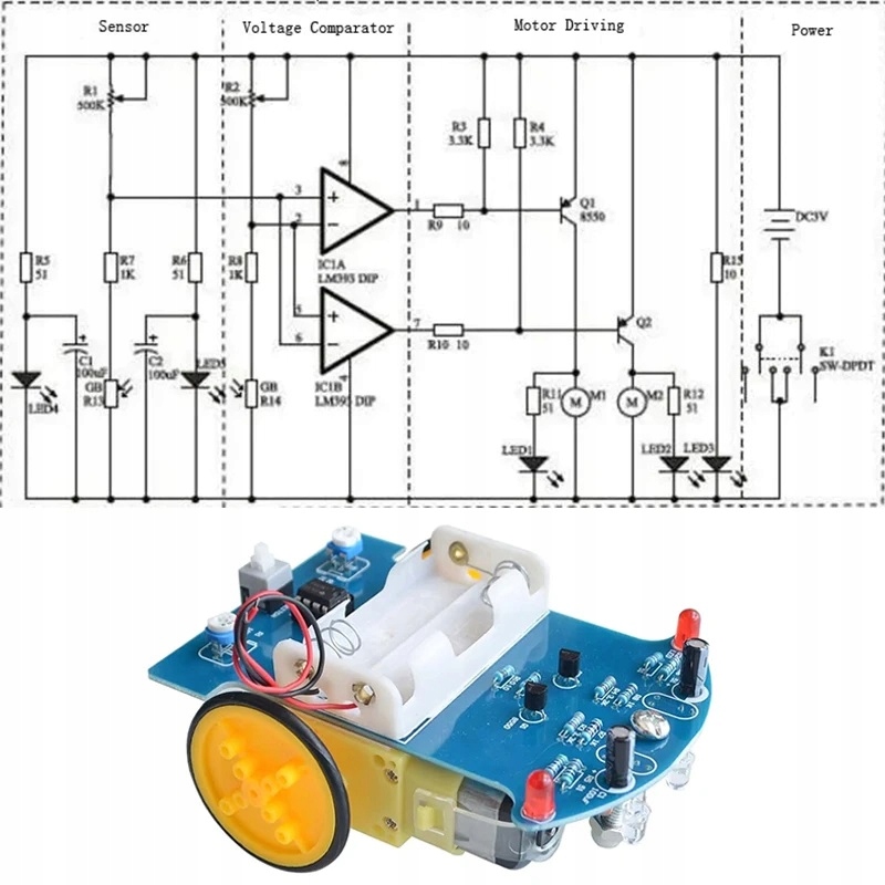 Після правильного складання робот рухається за чорною лінією на землі. Система працює завдяки світлодіодам і фоторезистору.