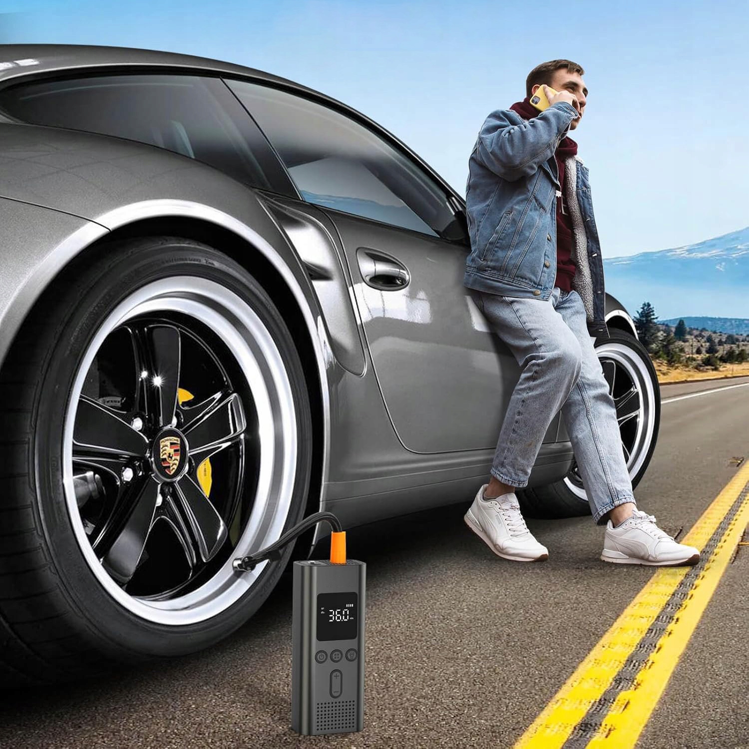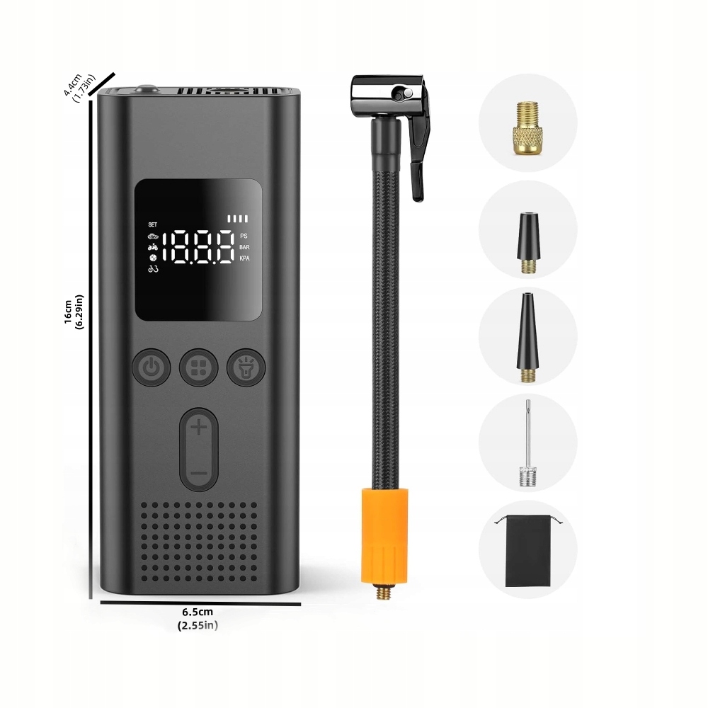 - Це може швидко збільшити тиск автомобіля від 1,93 бар до 2,3 бар (28 фунт/кв.дюйм до 34 фунт/кв.дюйм) менше ніж за хвилину та тиск у шині дорожнього велосипеда до 100 фунтів на кв. 4