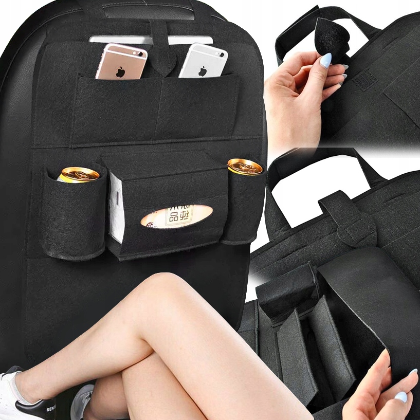 Отвори в дві сторони дозволяють легко помістити в нього коробку або сумку, а спеціально вирізаний отвір у центральній частині кишені дозволяє виймати окремі серветки, не витягуючи всю річ з органайзера. Дві вертикальні плоскі кишені, розташовані по центру, забезпечують простір для додаткових речей. Дві наступні крайні кишені ширші, і в них легко поміститися менша банка, пляшка з напоєм або дитяча пляшка.