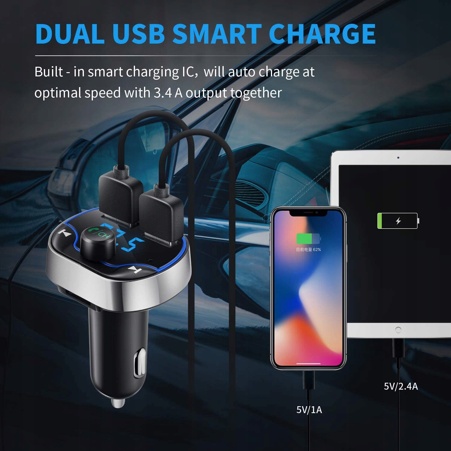 - 2 USB-порти для заряджання Процес заряджання 5 В/2,4 А плюс зарядний порт 5 В/1 А (із символом музики) для швидшої та стабільнішої швидкості заряджання. РК-дисплей 3,65 см показує вхідні дзвінки, напругу акумулятора автомобіля, гучність, частоту FM і назву пісні.