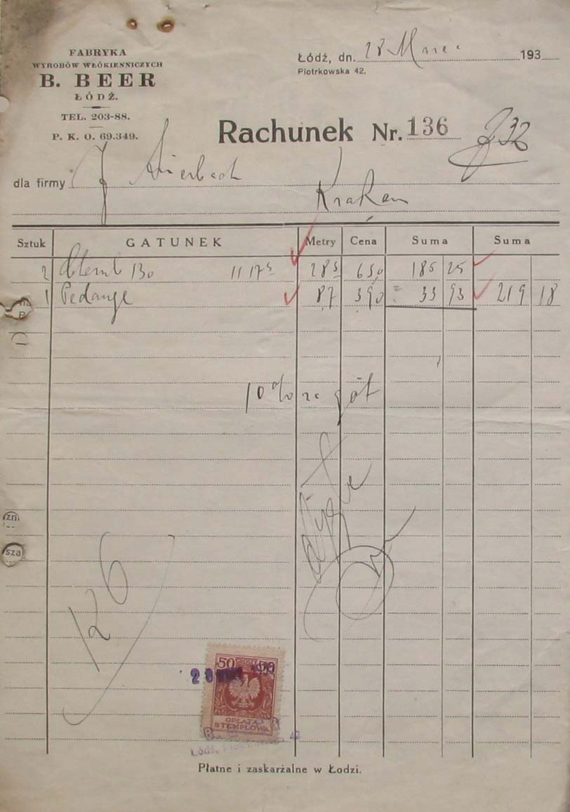 Рахунок на фірмовому бланку, на суму 219 злотих 18 грошів 10% (дисконт?) готівкою. Унизу погашена марка гербового збору номіналом 50 грошей. Дата 28 березня 1932 р. Формат 19х27,5 см, стан добрий. [ ЛОДЗЬ ][ БІЛЬ ][ ТЕКСТИЛЬНА ПРОМИСЛОВІСТЬ ]