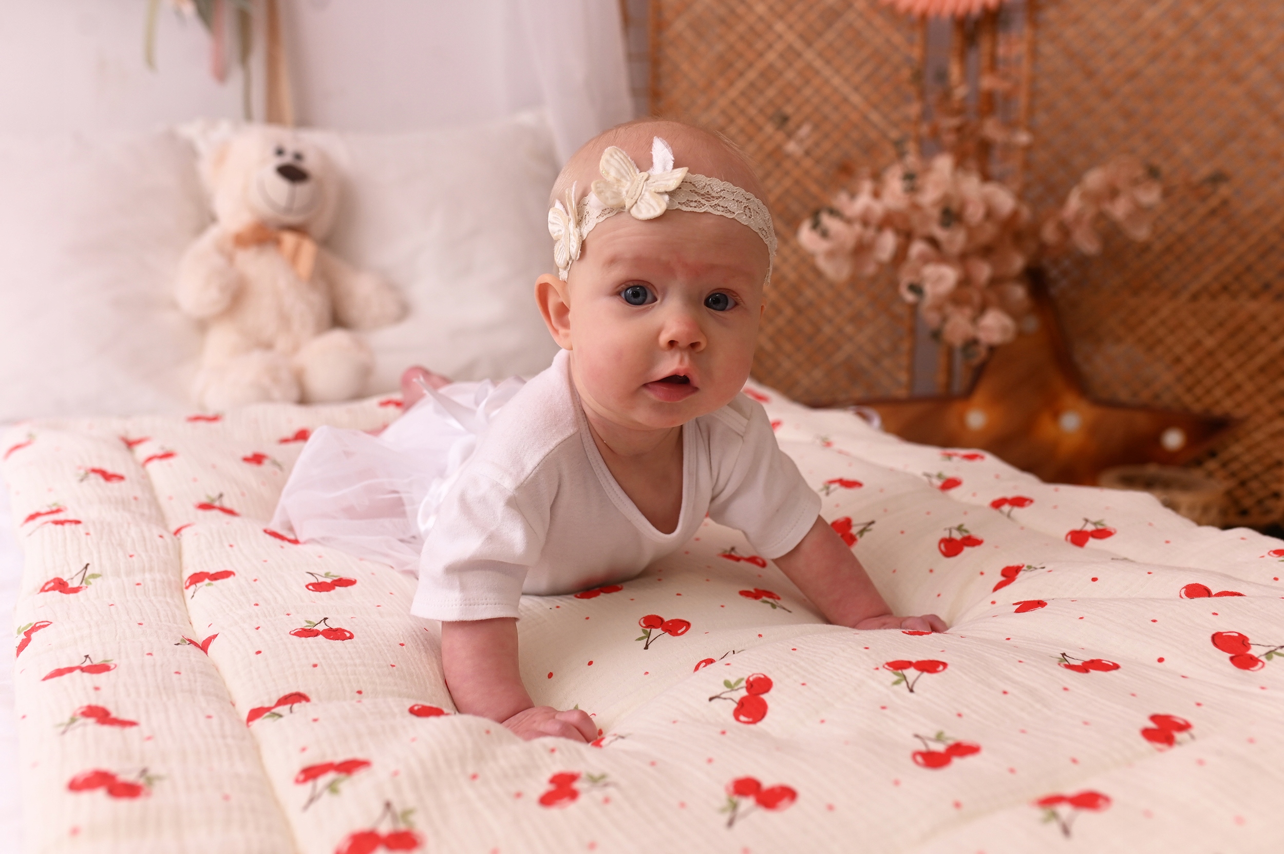 - натуральний бавовняний муслін - дихаюча, подвійна тканина з чарівним малюнком Wisienek; легкий, м'який і надзвичайно ніжний для шкіри дитини.