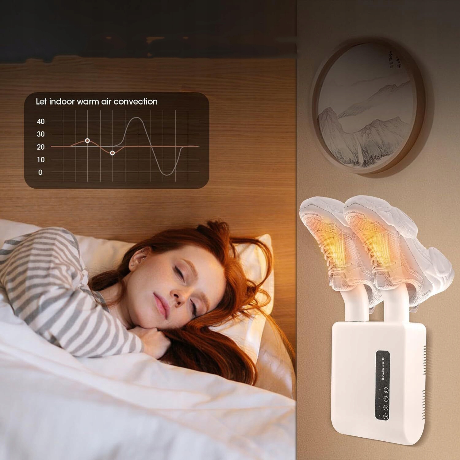 Запустивши одну кнопку, сушарка може досягти постійної температури 40 ° -42 ° за 15 секунд після увімкнення. Режими таймера можна встановити так, щоб вони автоматично вимкнули. За допомогою цифрового дисплея, простий у використанні. Багатофункціональна сушарка взуття працює безпечно і спокійно, заощаджуючи енергію та споживаючи мало енергії.
