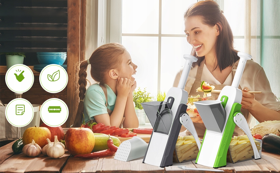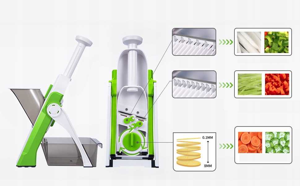 - Використовуйте різні варіанти нарізки, просто натисніть на ручку, швидко нарізати посуд та приготувати кубики, палички, шматочки, смужки та чіпси фруктів та овочів з якістю ресторану в оці.