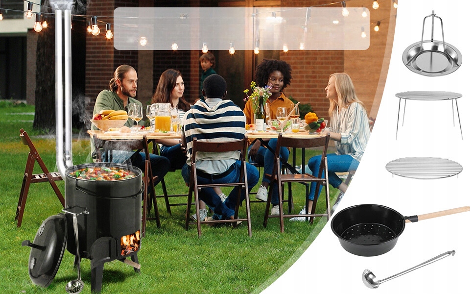 З нашою піччю для гуляшу ви можете використовувати різні техніки приготування їжі. Окрім приготування (емальована каструля об’ємом 21 літр), ви також можете приготувати хрустку курку та інші страви на грилі.