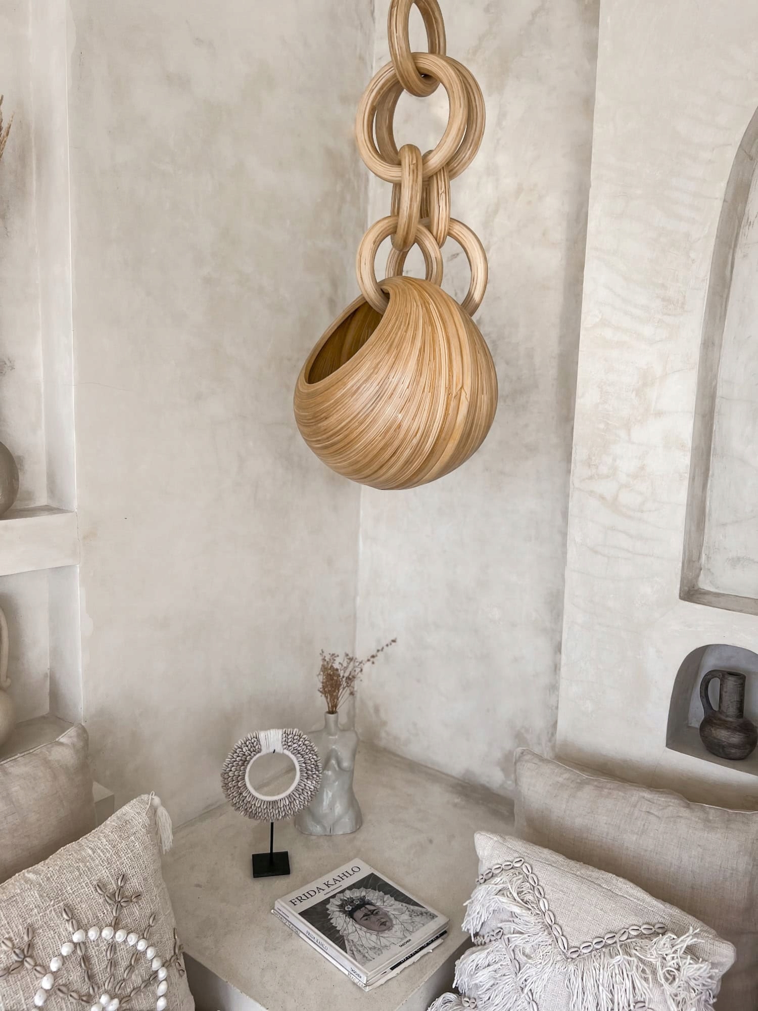Бамбукова підвісна прикраса з бамбуковим Бохо Талі - це унікальний елемент декору, який додасть унікальному персонажі вашим інтер'єрам. Виготовлений вручну місцевими майстрами на Балі, кожна прикраса - це унікальний витвір мистецтва, який поєднує традиційні методи ремесла з сучасним стилем Бохо.