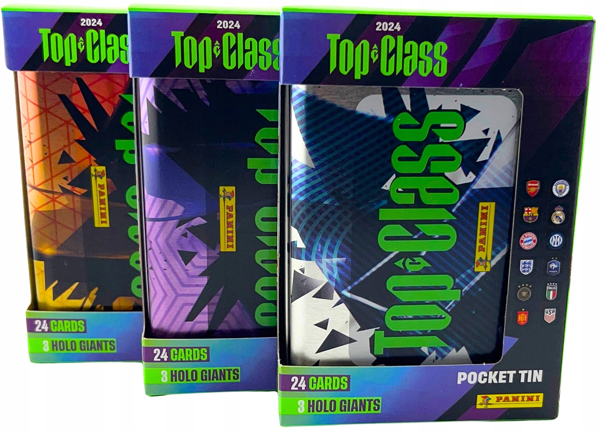Банка Top Class 2024, 3 пакетики, 3 футбольні картки Holo Giants Panini