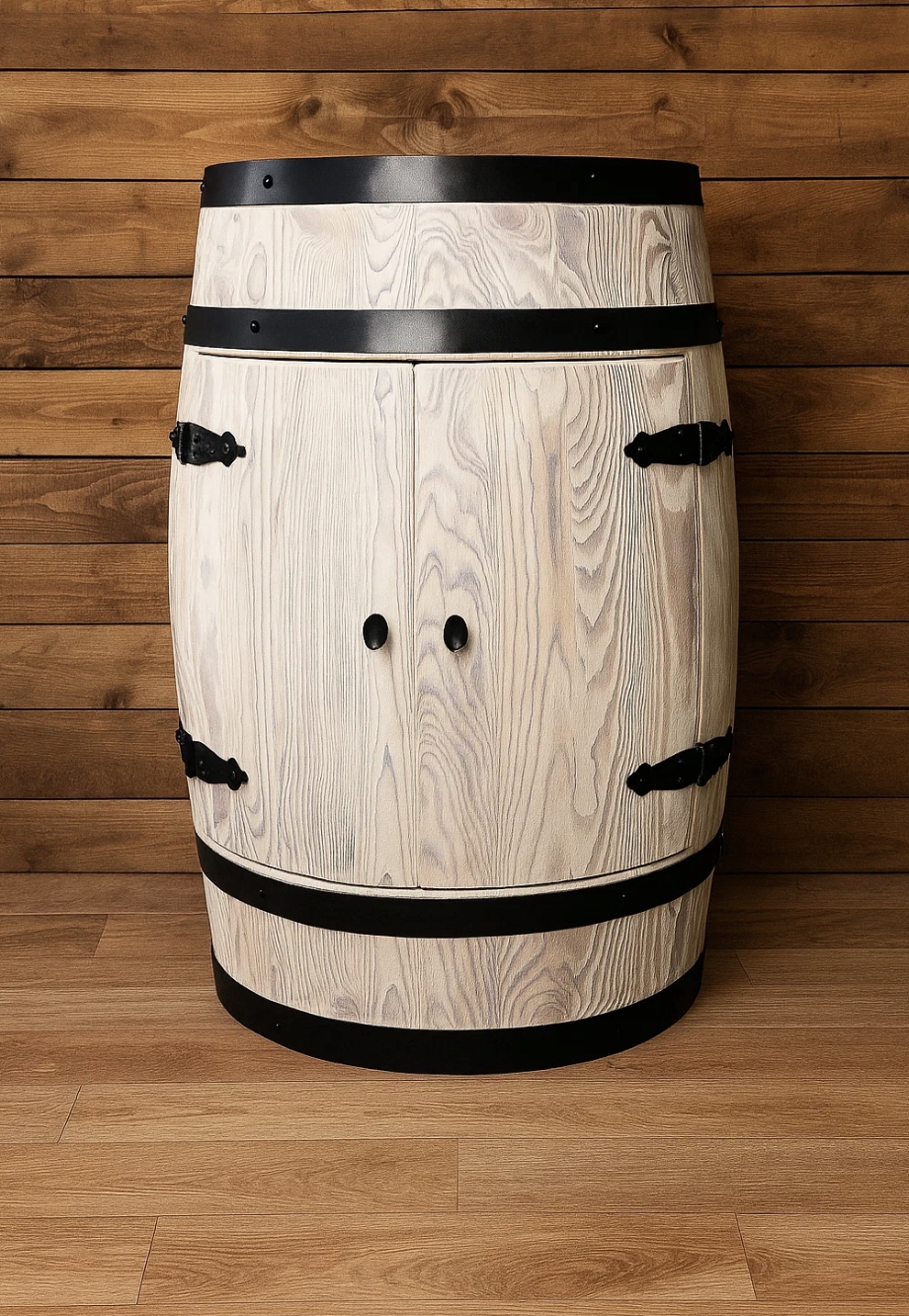 Покладіть всередину унікальну атмосферу з плечем у вигляді руки, встановленої дерев’яної бочки в елегантній білої білої обробки . Це не лише ефективний предмет меблів, але й практичне місце для зберігання алкоголю та скла - ідеально підходить для вітальні, офісу, домашнього плеча чи ресторану.