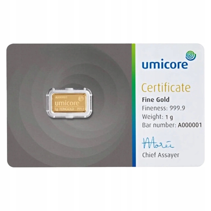 Золоті смуги від авторитетного виробника дорогоцінних металів Umicore - це інвестиційний продукт на 1 грам, ідеально підходить для диверсифікації портфеля. Золотий бар був виготовлений з чистого випробування руди 999.9 і знаходиться в сертифікованій безпеці - Certipack. Варто додати, що емітент Golden Pherse має акредитацію LBMA, завдяки чому він надає свою продукцію з найвищою можливою гарантією якості.