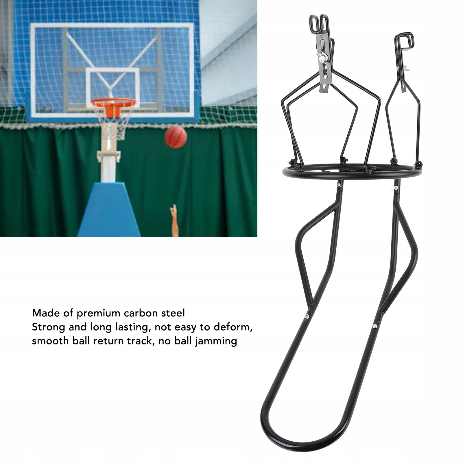 3. Система кріплення безпечного обідка: оснащена трьома великими металевими гачками, буде безпечно прикріплена до баскетбольного ободу і може бути знову встановилася, щоб змінити напрямок повернення без ковзання.