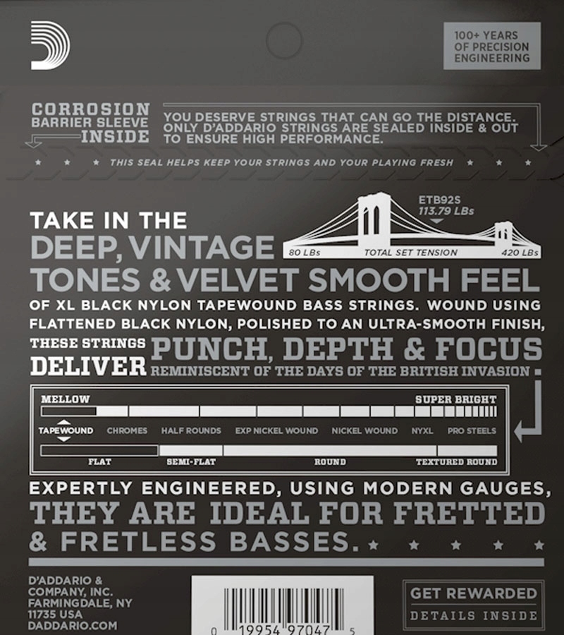 d'Addario - один з найпопулярніших струнних виробників у світі. Ця сімейна компанія має традицію створення струн з 17 століття і успішно пов'язує її з новітніми матеріалами та технологіями, пропонуючи сенсаційні рядки практично кожному інструменту. Струни D'Addario вибирають найкращі музиканти незалежно від стилю чи інструменту, який вони грають. Басові струни D'Addario Tapewound були розроблені для отримання глибокого теплого звуку з гладкою поверхнею, поранені за допомогою сплющеного чорного нейлону, який відшліфований до надвисокої обробки. Ці довговічні, добре вбалансовані рядки професійно розроблені для забезпечення оптимальної напруги та належним чином адаптовані до стандартних сідла та мостів. Для використання як у порогових, так і в непорогових басах.