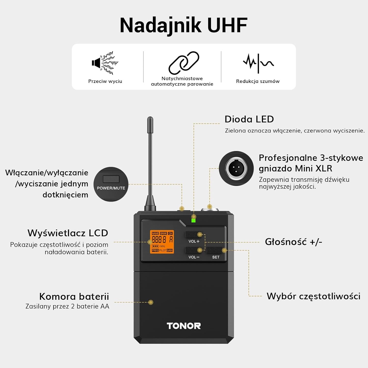 - Тверді та довговічні матеріали: Високоякісне корпус ABS спеціально розроблений для того, щоб зробити його стійким до впливу та корозії. Передавач BodyPack має незалежну кнопку управління гучністю та замовчування функції з одним дотиком, щоб запобігти перешкодам.