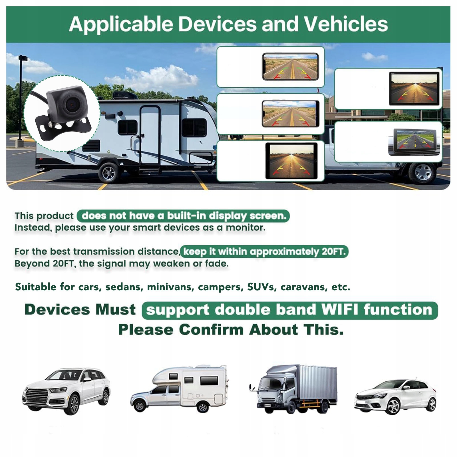 1. Багатофункціональність: бездротова камера заднього огляду мобільного телефону 2.4G має надзвичайну продуктивність, роздільну здатність високої чіткості 1080P, широкий кут огляду 175 градусів і водонепроникність IP67. Підходить для невеликих транспортних засобів із швидкою реакцією, стабільним відеосигналом і нульовим зависанням зображення. Підходить для легкових автомобілів, седанів, мінівенів, кемперів, позашляховиків, будинків на колесах тощо.
