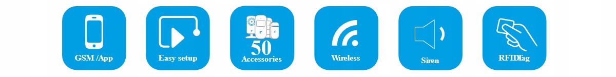 - інформація про тривогу надсилається на мобільний телефон - контрольна панель підтримує 50 бездротових і 50 датчиків RFID - можливість програмування 5 номерів тривоги та 1 номера швидкого набору - запис голосових нотаток - постановка та зняття з охорони через SMS або телефон безкоштовно - вбудований -вхідна сирена (110 дБ) - резервне живлення - літій-іонний акумулятор - SMS-повідомлення про збій живлення, відновлення енергії та низький заряд батареї - Частоти GSM: 850/900/1800/1900 МГц - радіочастота: 315 МГц/433 МГц (± 75 кГц) - вхід: 110 змінного струму - 240 В/50-60 Гц - вихід: 12 В постійного струму/500 мА
