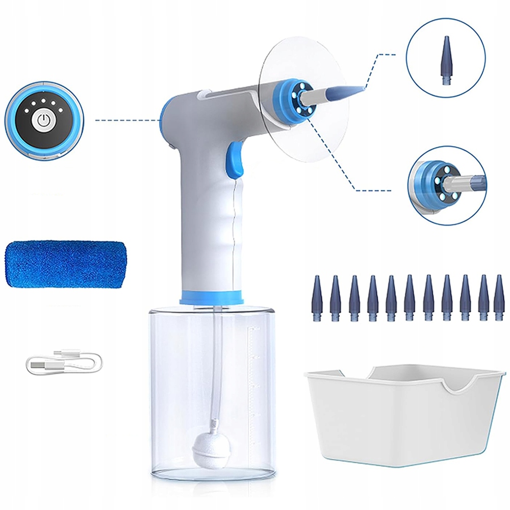 Електричний душ для очищення вуха за допомогою воску має м'який наконечник силікону, який можна замінити після використання. 1 резервуар для води, 10 кінчиків (наконечник з п'ятьма отворами X1, наконечник з одним отвором X9) та кабелем зарядки USB