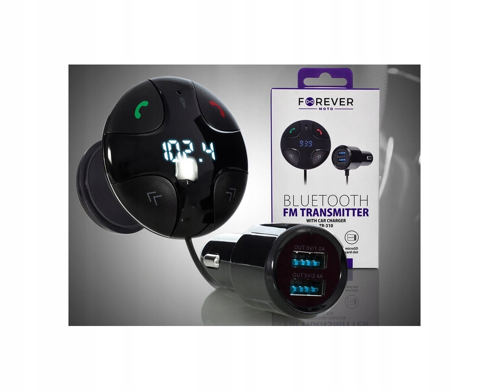 Передавач складається з двох елементів. Перший — це вилка, яку слід вставити в гніздо автомобільного прикурювача 12-24 В. Другий - панель управління з дисплеєм, кнопками управління, слотом для карти пам'яті micro SD і вбудованим мікрофоном! Обидва елементи з'єднані між собою кабелем довжиною 140 см!