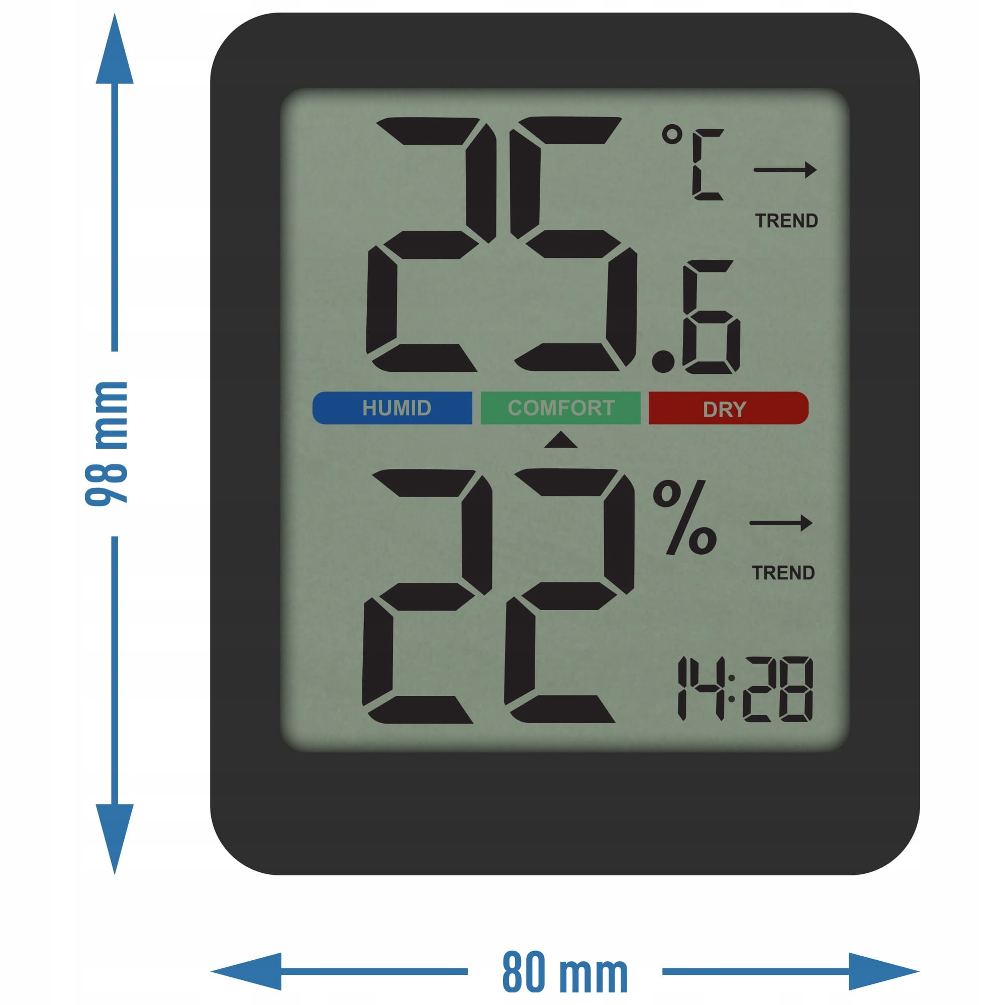 Це невеликий пристрій з нашої пропозиції - електронний термометр з годинником і індикатор рівня вологості дозволить вам постійно контролювати рівень комфорту у вашій квартирі, офісі або, наприклад в будинку на сюжеті. Великі, розбірливі числа повідомить вас про поточну температуру та рівень вологості, а барвистий рівень комфорту три stage полегшить вам швидко визначити, чи в інтер'єрах це не надто сухе чи занадто волого.