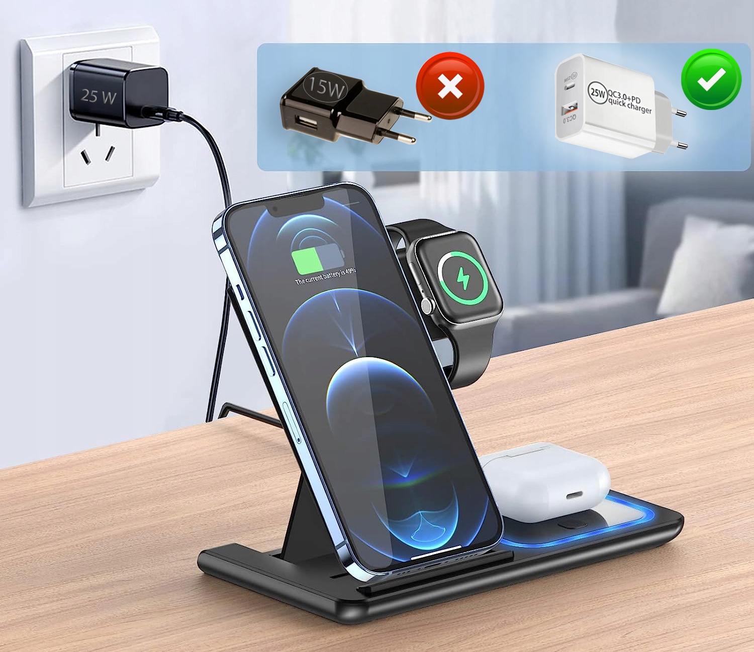 Бездротовий індуктивний зарядний пристрій 3 в 1 для Apple + адаптер живлення 25 Вт