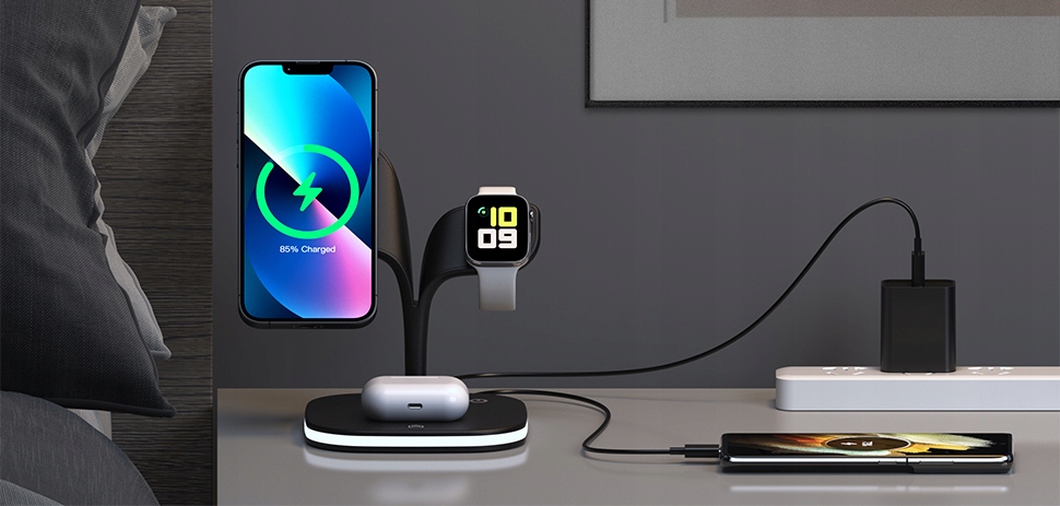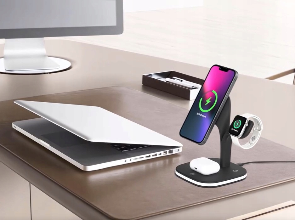 Зарядна станція 5 в 1 забезпечує швидку індукційну зарядку iPhone, Apple Watch і AirPods. Крім того, він має вихід USB з можливістю зарядки будь-якої техніки. Простий, мінімалістичний дизайн ідеально підходить для будь-якого інтер'єру та ідеально поєднується з пристроями Apple. Він призначений для швидкої зарядки новітніх смартфонів Apple, оснащених системоюMagSafe. Зарядний пристрій має роз’єм MagSafe для заряджання iPhone, магнітний роз’єм Apple Watch, зарядний пристрій Qi для Apple AirPods і порт USB.