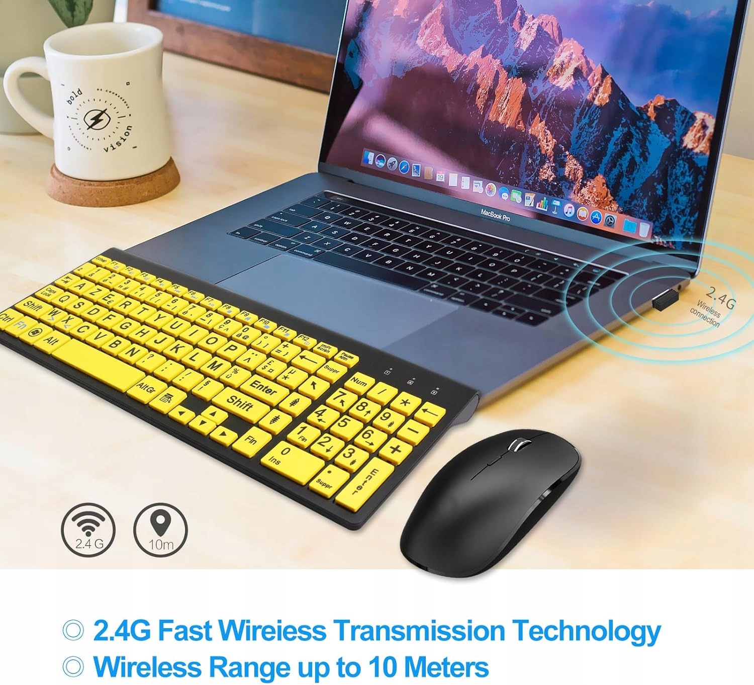 ❇️❇️Sienstar is an innovative set бездротової клавіатури та мишей, розроблених для людей з проблемами зору. Завдяки великим, чітким літерам у контрастному жовтому кольорі клавіатура забезпечує простіше написання та експлуатацію пристрою для людей з амбліопією. Це ідеальне рішення для людей похилого віку, людей із проблемами зору, а також для шкіл, бібліотек та компаній, які підтримують людей з винятковими потребами. 4 Приймач Nano 2.4G забезпечує стабільне з'єднання і інтегрується в клавіатуру, що полегшує транспорт та зберігання. Компактний розмір та повний клавіш (102 клавіші) забезпечує комфорт, а тихо клацання кнопок і мишей забезпечує комфорт використання в будь -яких умовах.