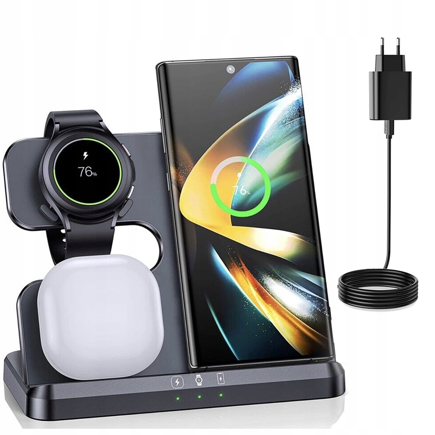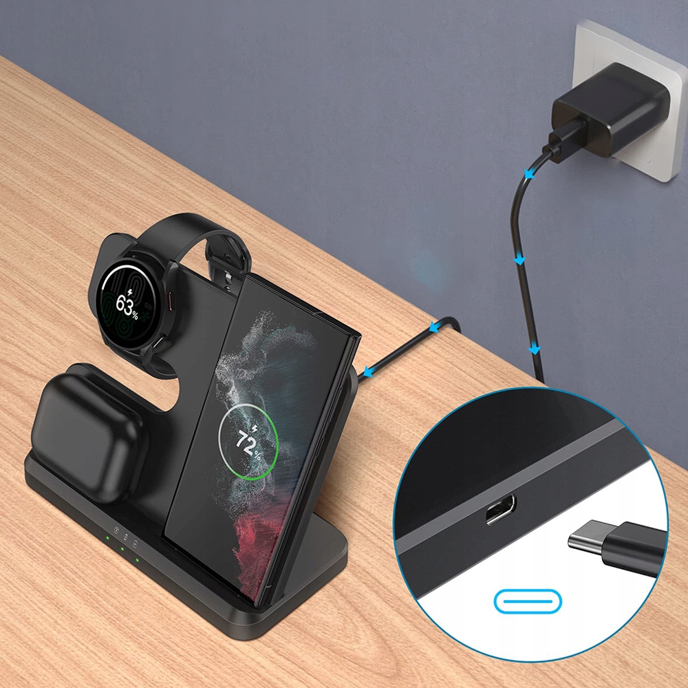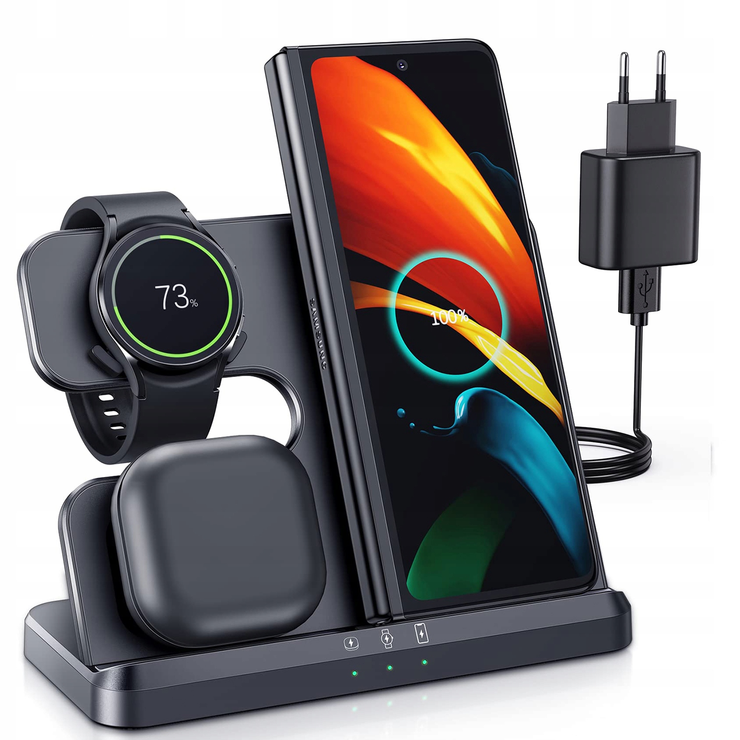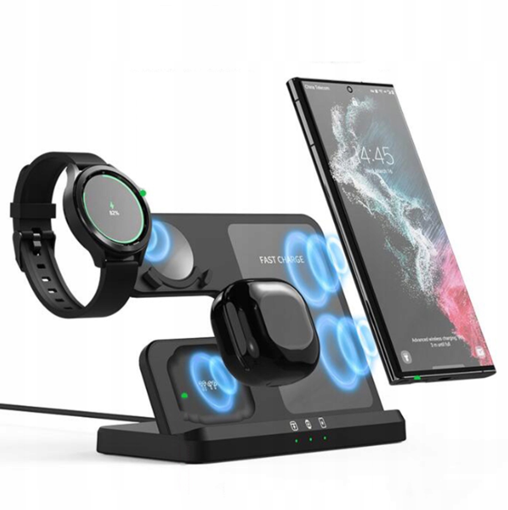 🔌3-в-1 швидкий зарядний пристрій з адаптером QC 3.0 18 Вт- індукційна зарядна станція. За допомогою цієї зарядної станції 3-в-1 ви можете заряджати кілька пристроїв одночасно в одному місці, акуратно та охайно. Заряджайте свій мобільний телефон, Galaxy Watch, Buds одночасно, а також як тримач для мобільного телефону. Також сумісний з телефонами iPhone/Huawei. Зарядна підставка живиться від адаптера 18 Вт QC-3.0, що входить у комплект. Бездротовий зарядний пристрій для телефону. Повна зарядка за 3 години.